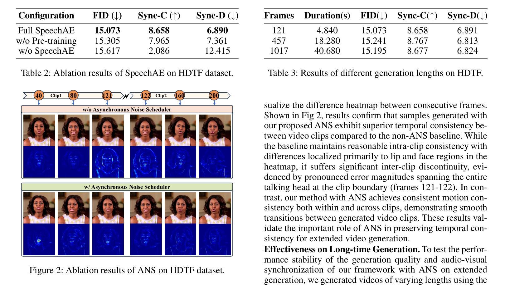 - 预训练的语音自编码器(SpeechAE)用于生成与时间压缩的语音潜在代码相对应的视频潜在空间。