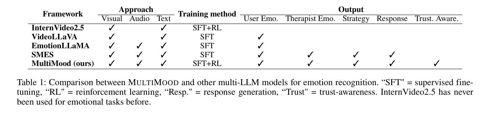 Summary:在如今世界,情感支持变得越来越重要,然而,对寻求帮助者和提供帮助者来说仍面临挑战。多模式情感支持方法通过整合各种数据源提供富有同情心的、语境相关的回应,显示出巨大潜力。然而,当前方法存在诸多局限性,通常只依赖文本或将其他数据类型转换为文本,仅提供情感识别,忽略了多模式输入的潜力。为解决这些问题,我们引入了一个新的框架“MultiMood”,它能利用视频、音频和文本的多元嵌入来预测情感成分并产生与专业的治疗标准相符的响应。为了提高可信度,我们还结合了新型心理标准和强化学习(RL)来优化大型语言模型(LLM)。通过多模式分析验证了MultiMood框架的有效性,并且在MESC和DFEW数据集上的实验结果验证了其在RL驱动下可信度的提高。关键要点: