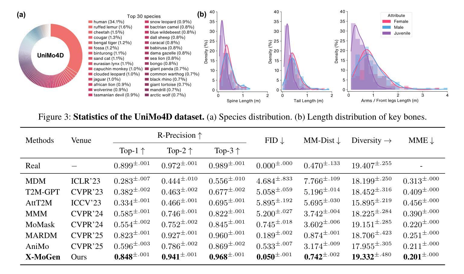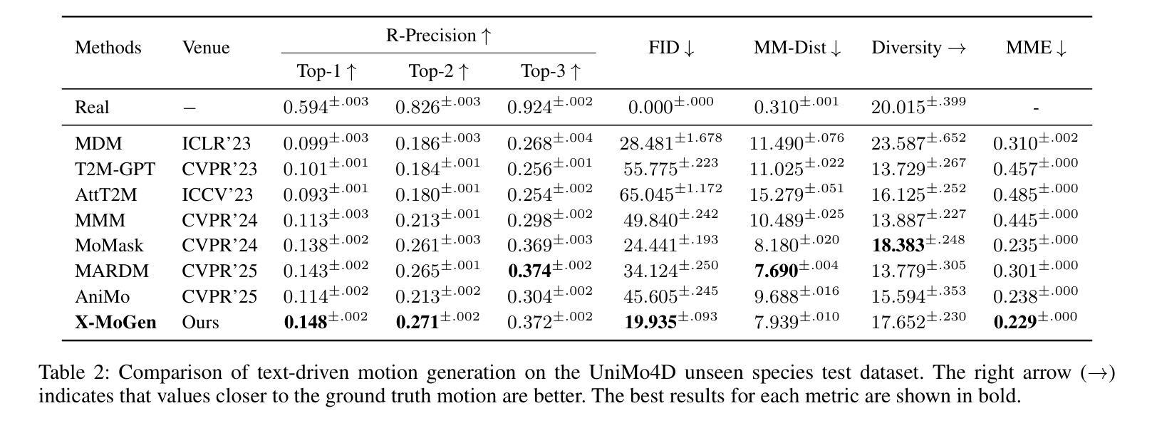 - X-MoGen在UniMo4D数据集上的实验表明,其在已见和未见物种上的表现均优于现有方法。