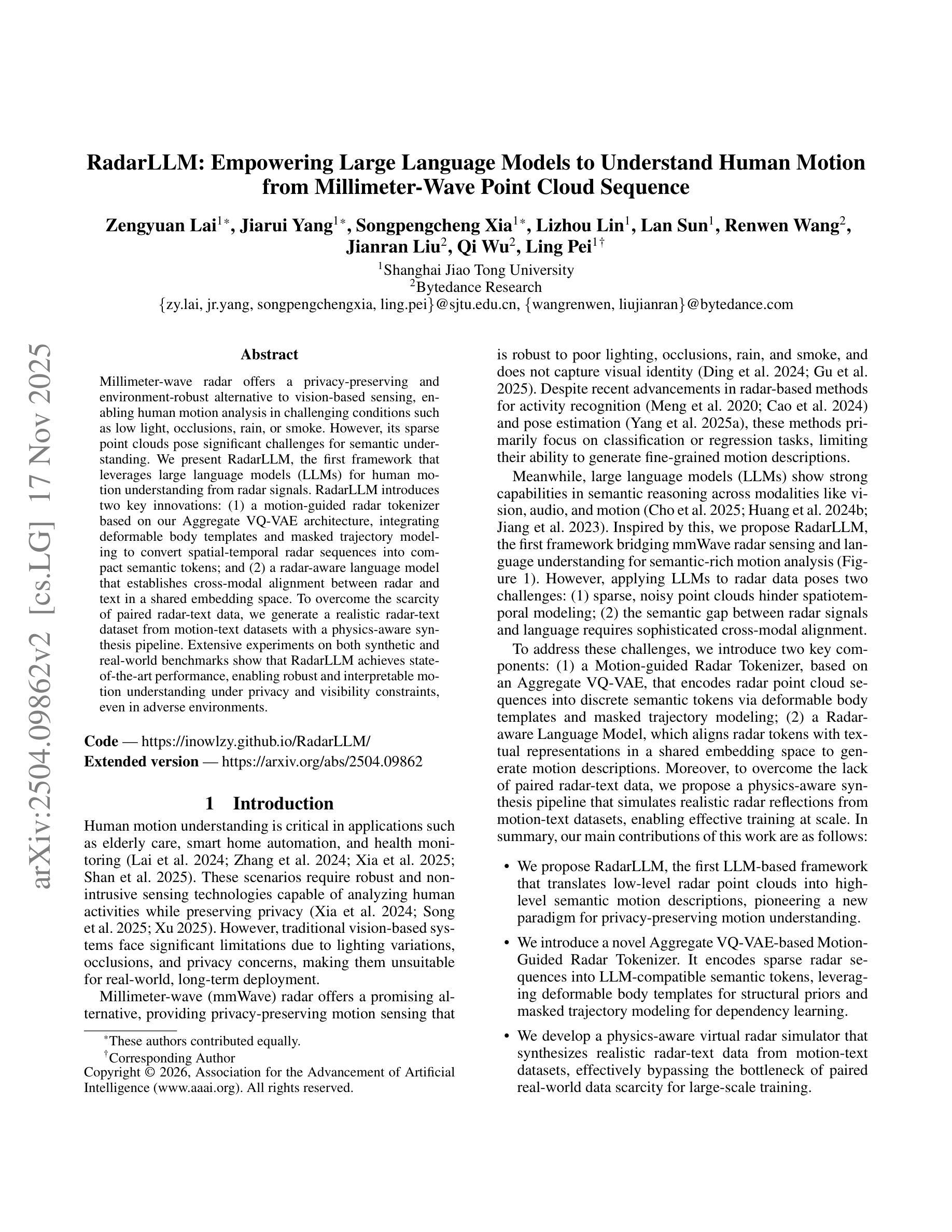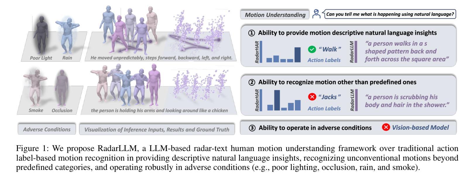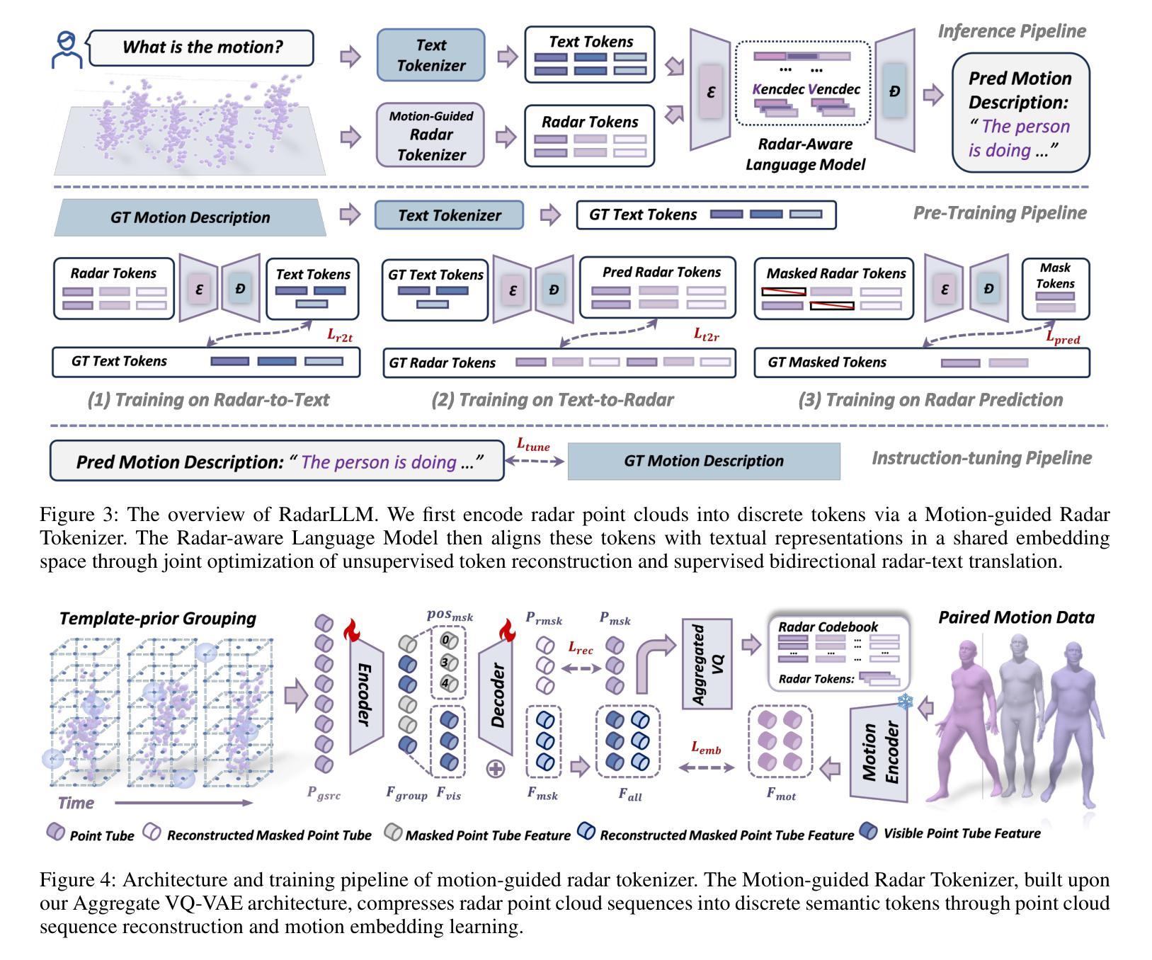 Summary:毫米波雷达提供了一种隐私保护和环境适应性强的替代方案,用于在视线感知基础上进行人体运动分析,尤其在低光、遮挡、雨雪等恶劣环境下表现优异。然而,雷达稀疏点云给语义理解带来挑战。我们推出RadarLLM框架,首次利用大型语言模型(LLM)理解雷达信号的人体运动。RadarLLM引入两项关键创新:一是基于Aggregate VQ-VAE架构的运动引导雷达分词器,集成可变形体模板和掩膜轨迹建模,将时空雷达序列转换为紧凑语义令牌;二是雷达感知语言模型,在共享嵌入空间中建立雷达和文本之间的跨模态对齐。为了克服配对雷达文本数据的稀缺性,我们通过物理感知合成管道从运动文本数据集中生成逼真的雷达文本数据集。实验表明,RadarLLM在合成和真实世界基准测试中达到最新性能水平,实现了隐私和可见性约束下的稳健和可解释运动理解,即使在恶劣环境中也是如此。这篇文章已被接受在AAAI 2026进行展示。这是包含补充材料的扩展版。