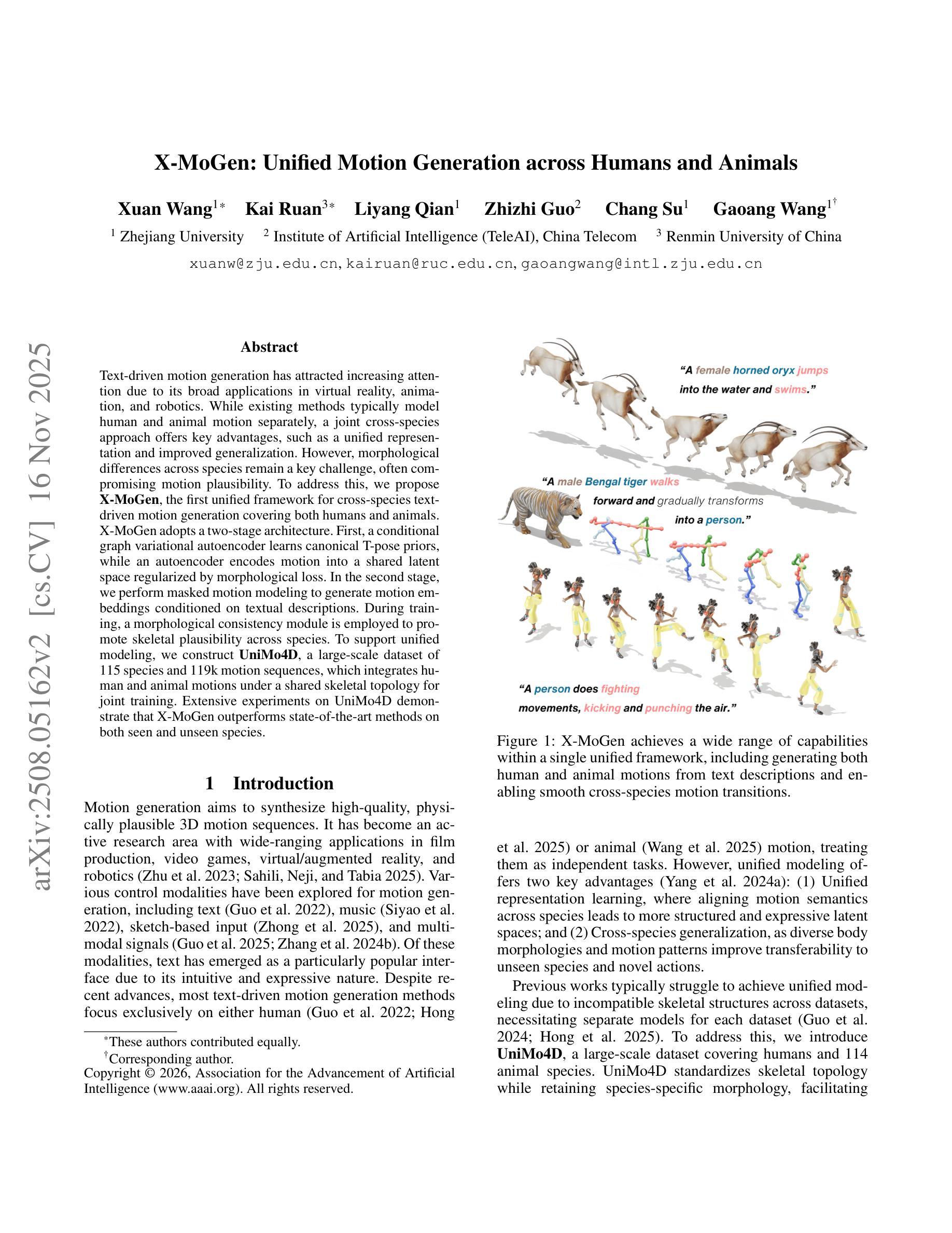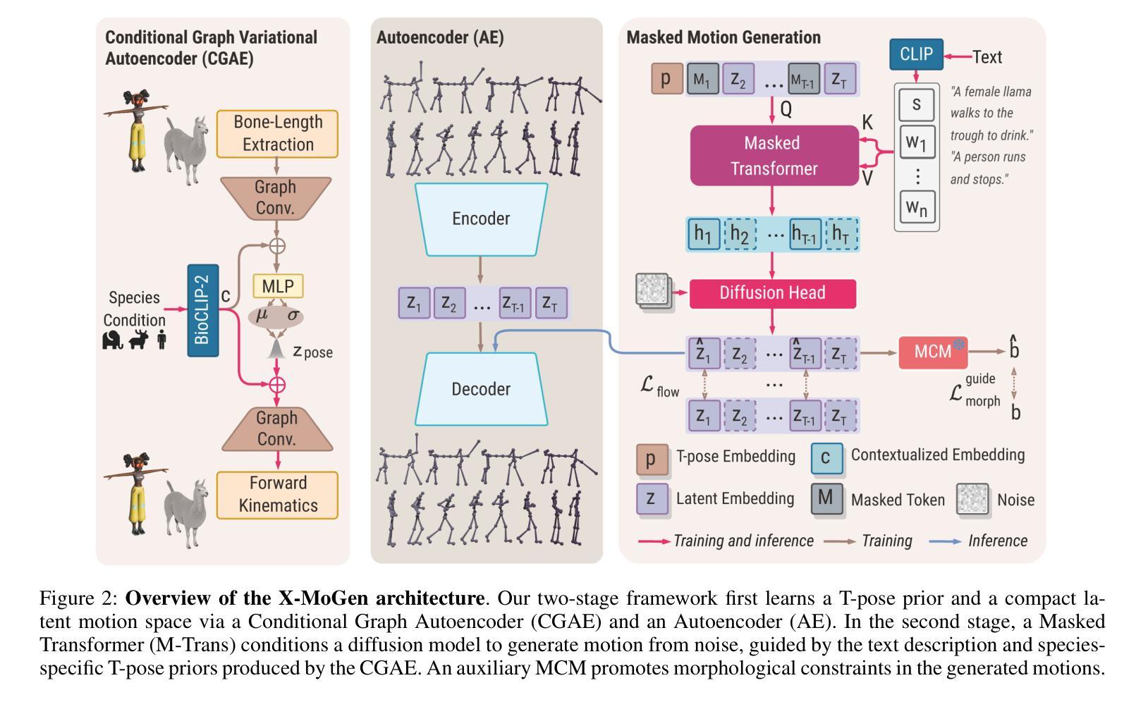 文本驱动的运动生成因其广泛应用于虚拟现实、动画和机器人技术而备受关注。尽管现有方法通常分别对人体和动物的运动进行建模,但联合跨物种方法提供了关键优势,如统一表示形式和提高泛化能力。然而,物种间的形态差异仍然是关键挑战,经常影响运动的合理性。为了解决这一问题,我们提出了X-MoGen,这是第一个统一的跨物种文本驱动运动生成框架,涵盖人类和动物。X-MoGen采用两阶段架构。首先,条件图变分自动编码器学习标准T姿势的先验知识,而自动编码器将运动编码为受形态损失约束的共享潜在空间。在第二阶段,我们进行掩膜运动建模,根据文本描述生成运动嵌入。在训练过程中,采用形态一致性模块来促进跨物种的骨骼合理性。为了支持统一建模,我们构建了UniMo4D,这是一个包含115个物种和11.9万多个运动序列的大规模数据集,它在统一的骨骼拓扑结构下整合了人类和动物的运动,用于联合训练。在UniMo4D上的广泛实验表明,X-MoGen在已知和未知物种上的表现均优于最先进的方法。