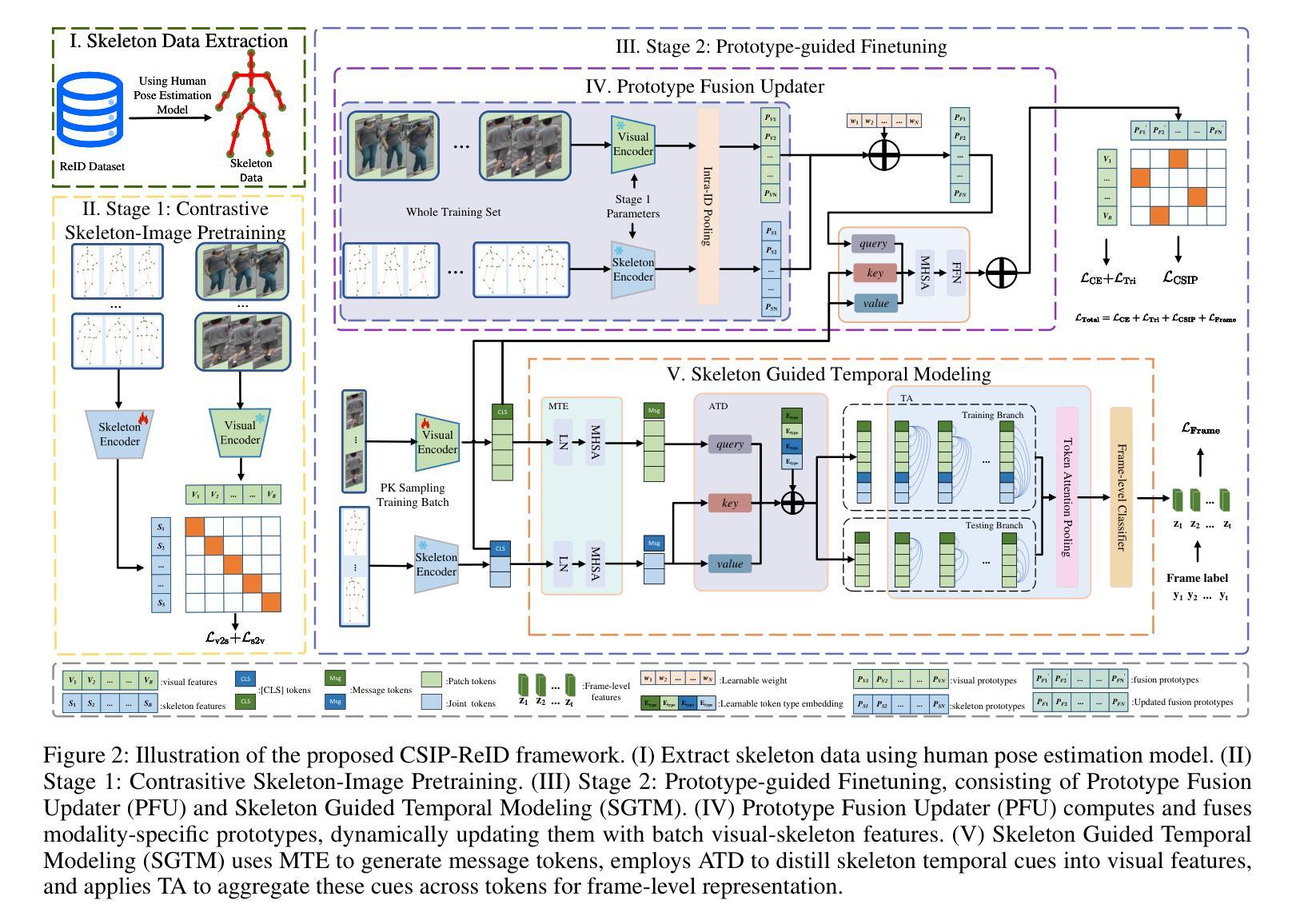 本文提出了一个基于骨架驱动的视频人物再识别预训练框架,名为对比骨架图像预训练再识别(CSIP-ReID)。该方法分为两个阶段,第一阶段利用对比学习对齐骨架和视频特征的序列水平;第二阶段通过动态原型融合更新器(PFU)和多模态身份原型融合运动与外观线索。此外,还提出了骨架引导时序建模模块(SGTM),从骨架数据中提取时序线索并将其融入视觉特征。实验表明,CSIP-ReID在视频再识别标准数据集上取得了最新成果,并具有良好的骨架再识别任务泛化能力。