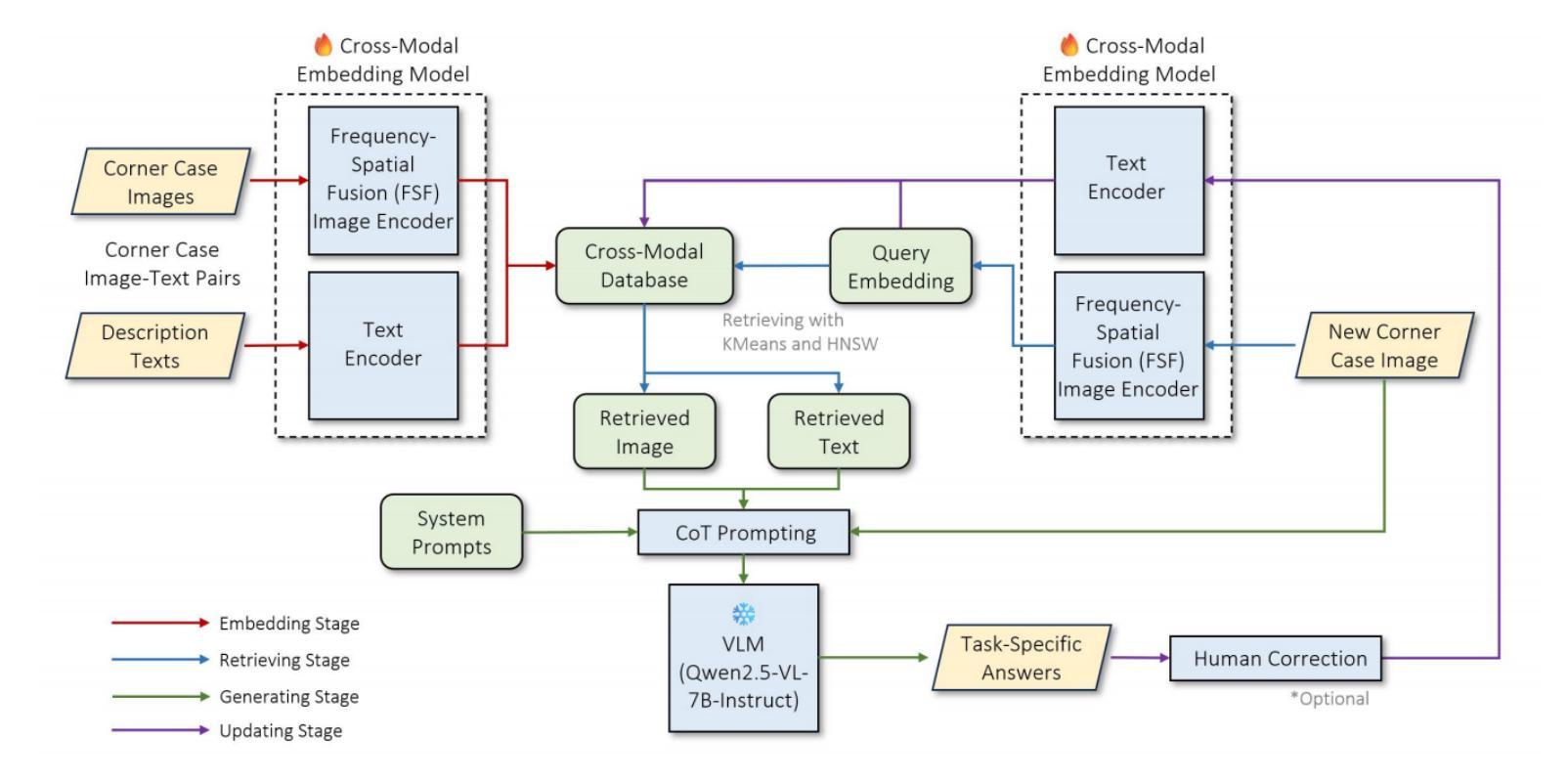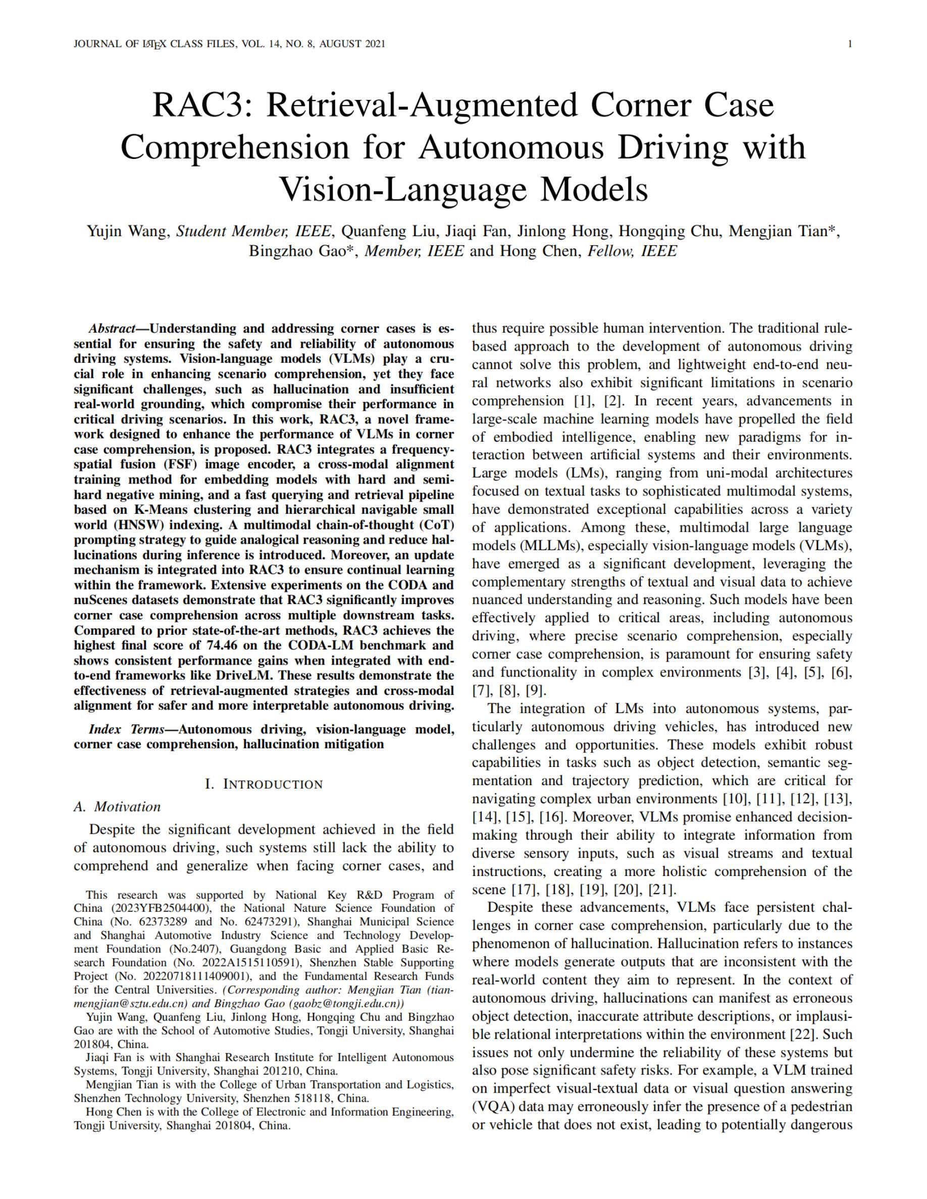 理解并处理边界情况对于确保自动驾驶系统的安全性和可靠性至关重要。视觉语言模型(VLMs)在提高场景理解方面发挥着至关重要的作用,但它们面临着巨大的挑战,如幻觉和现实世界定位不足,这会影响它们在关键驾驶场景中的表现。在这项工作中,提出了RAC3这一新型框架,旨在提高VLMs在边界案例理解方面的性能。RAC3集成了频率空间融合(FSF)图像编码器、用于嵌入模型的跨模态对齐训练方法和硬负样本及半硬负样本挖掘、基于K-Means聚类和分层可导航小型世界(HNSW)索引的快速查询和检索管道。还引入了一种多模态思维链(CoT)提示策略,以引导类比推理并在推理过程中减少幻觉。此外,RAC3还集成了更新机制,以确保框架内的持续学习。在CODA和nuScenes数据集上的大量实验表明,RAC3在多个下游任务中显著提高了边界案例的理解能力。与之前的最新方法相比,RAC3在CODA-LM基准测试中取得了最高分74.46分,在与端到端框架(如DriveLM)集成时,表现出一贯的性能提升。这些结果证明了检索增强策略和跨模态对齐在更安全、更可解释的自动驾驶中的有效性。