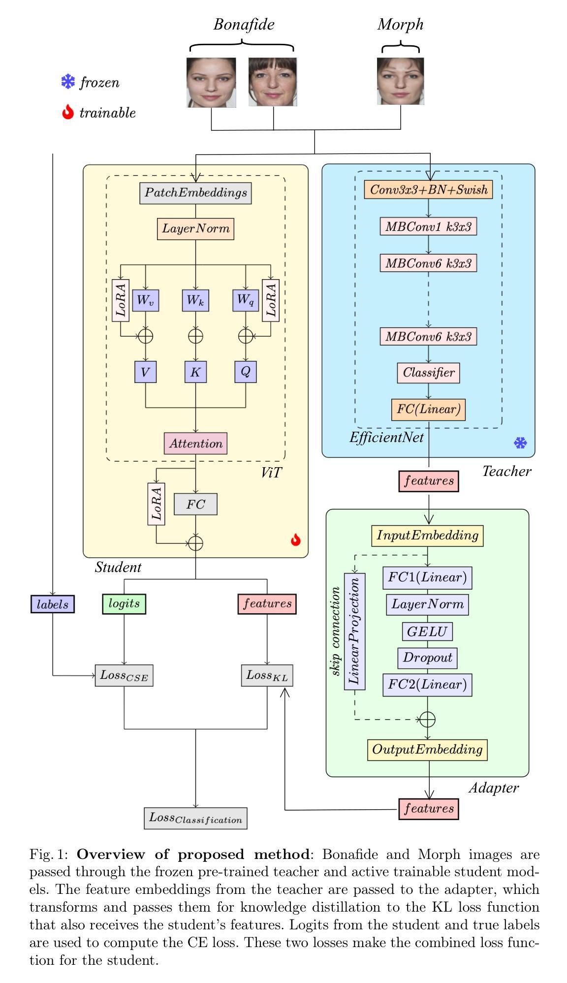 基于教师-学生框架,我们提出了一种新的单图像变形攻击检测(S-MAD)方法,使用CNN教师模型优化ViT学生模型。为提高效率,我们整合了低秩适应(LoRA)进行微调,降低计算成本的同时保持高检测精度。在由三个公开人脸数据集构建的变形数据集上进行了广泛实验,评估了模型的稳健性。与六种最先进的S-MAD技术相比,该方法在检测性能和计算效率方面均表现出优越性。