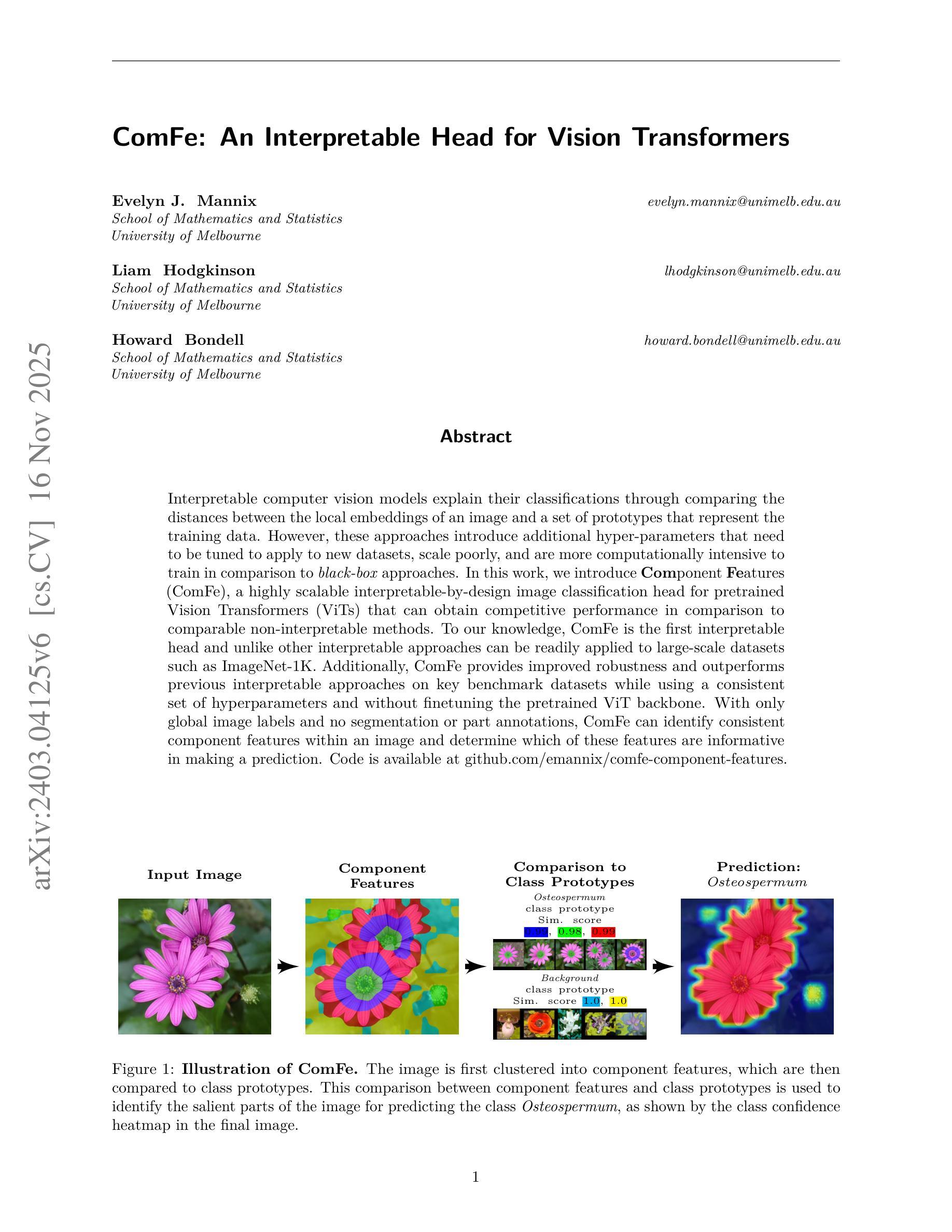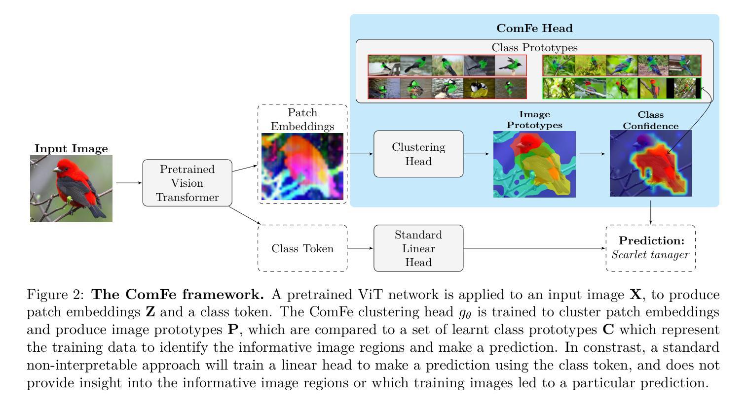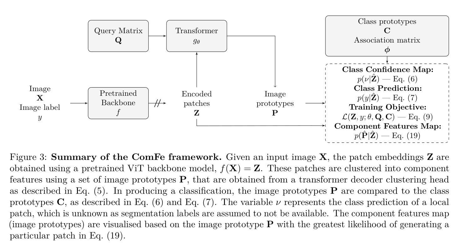 解释性计算机视觉模型通过比较图像局部嵌入与代表训练数据的一组原型之间的距离来解释其分类。然而,这些方法引入了额外的超参数,需要针对新数据集进行调整,扩展性差,与黑盒方法相比计算训练更为密集。在这项工作中,我们引入了组件特征(ComFe),这是一种为预训练的视觉变压器(ViTs)设计的可解释性图像分类头,具有高度的可扩展性,在与其他类似的非解释性方法相比时可以获得竞争性的性能。据我们所知,ComFe是第一个可解释的头部,不同于其他可解释的方法,它可以轻松应用于大规模数据集,如ImageNet-1K。此外,ComFe提供了改进的稳健性,并在关键基准数据集上优于之前的可解释方法,同时使用一组一致的超参数且无需微调预训练的ViT主干。仅使用全局图像标签,无需分割或部分注释,ComFe可以识别图像内的一致组件特征,并确定哪些特征在做出预测时是有用的。代码可在github.com/emannix/comfe-component-features找到。