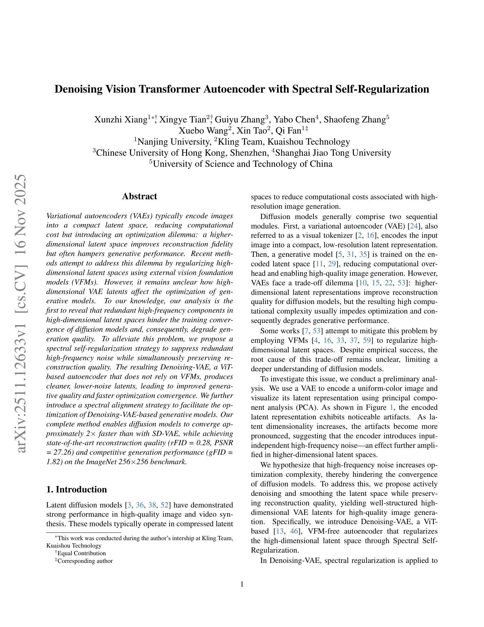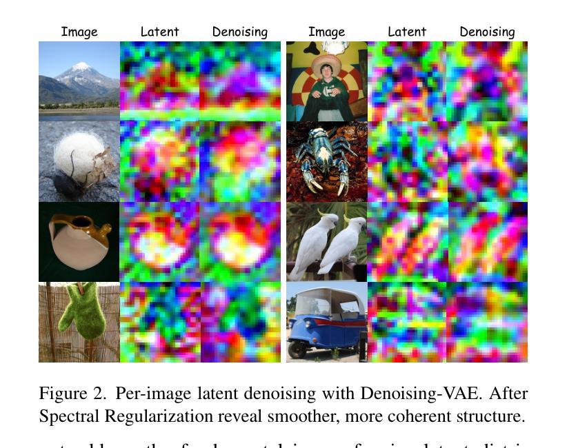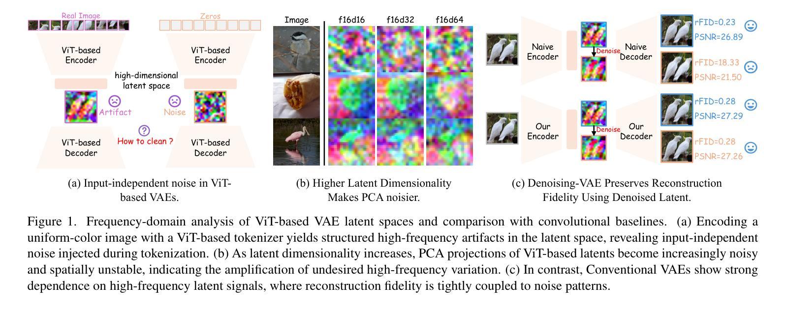 本文探讨了变分自编码器(VAEs)在高维潜在空间中对图像编码时面临的问题。研究发现,高维潜在空间中的冗余高频成分会阻碍扩散模型的训练收敛,影响生成质量。为解决这一问题,提出了谱自正则化策略,能够抑制冗余高频噪声,同时保持重建质量。基于此策略的Denoising-VAE模型,在不依赖外部视觉基础模型(VFMs)的情况下,生成了更清洁、低噪声的潜在空间,提高了生成质量和优化收敛速度。同时,还引入了谱对齐策略,有助于优化基于Denoising-VAE的生成模型。该方法使扩散模型的收敛速度大约提高了两倍,同时在ImageNet 256×256基准测试上实现了先进的重建质量(rFID = 0.28,PSNR = 27.26)和具有竞争力的生成性能(gFID = 1.82)。