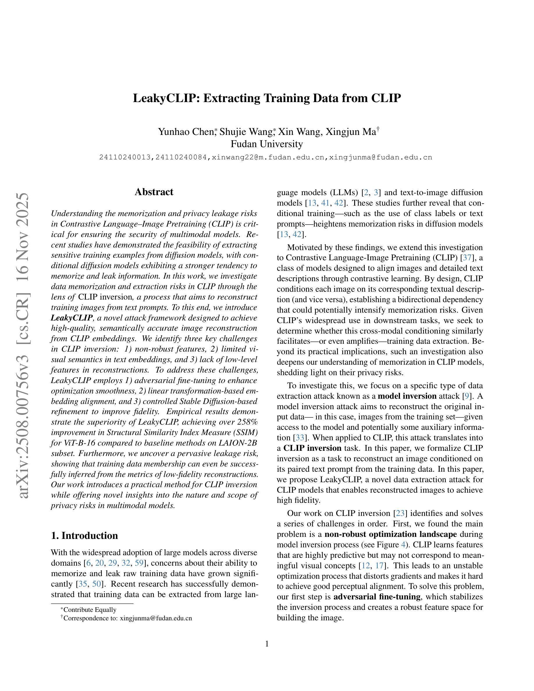 理解对比语言图像预训练(CLIP)中的记忆和隐私泄露风险对于确保多模态模型的安全性至关重要。最近的研究已经证明了从扩散模型中提取敏感训练实例的可行性,其中条件扩散模型表现出更强的记忆和泄露信息的倾向。在这项工作中,我们通过CLIP反转的视角来研究CLIP中的数据记忆和提取风险。CLIP反转是一个旨在从文本提示重建训练图像的过程。为此,我们引入了名为“LeakyCLIP”的新型攻击框架,旨在通过CLIP嵌入实现高质量、语义准确的图像重建。我们发现CLIP反转面临三个关键挑战:1)特征不稳健,2)文本嵌入中的视觉语义有限,以及3)重建保真度低。为解决这些挑战,LeakyCLIP采用1)对抗性微调以增强优化的平稳性,2)基于线性变换的嵌入对齐,以及3)基于稳定扩散的精炼以提高保真度。经验结果表明LeakyCLIP的优越性,在LAION-2B子集上与基准方法相比,ViT-B-16的结构相似性指数测量(SSIM)提高了超过258%。此外,我们发现了普遍的泄漏风险,并展示即使是从低保真重建的指标中也可以成功推断出训练数据成员身份。我们的工作介绍了一种实用的CLIP反转方法,同时提供了对多模态模型中隐私风险本质和范围的全新见解。
