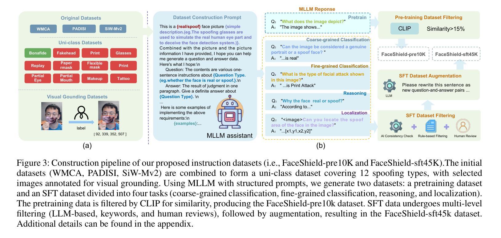 - 提出FaceShield,一种适用于面部反欺诈的多模态大型语言模型,可判断面部真实性、识别攻击类型、提供判断依据及检测攻击区域。