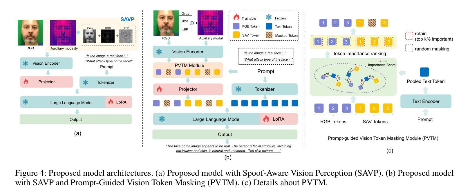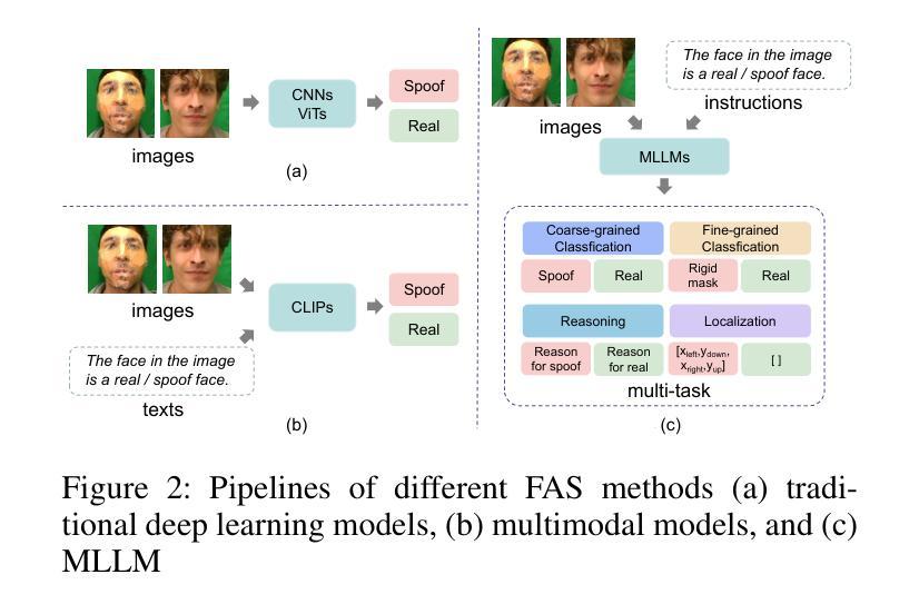 人脸识别防欺骗(Face Anti-Spoofing, FAS)对于保护人脸识别系统免受伪造攻击至关重要。之前的方法将这项任务视为一个分类问题,缺乏预测结果的可解释性和合理性。最近,多模态大型语言模型(Multimodal Large Language Models, MLLMs)在视觉任务的感知、推理和决策方面表现出了强大的能力。然而,目前尚未出现专门针对FAS任务的通用且全面的MLLM和专门设计的数据集。为了弥补这一空白,我们提出了FaceShield,这是一个用于FAS的MLLM,以及相应的预训练和监督微调(Supervised Fine-tuning, SFT)数据集FaceShield-pre10K和FaceShield-sft45K。FaceShield能够确定人脸的真实性、识别欺骗攻击的类型、为判断提供理由,并检测攻击区域。具体来说,我们采用了基于先验知识的欺骗感知视觉感知(Spoof-Aware Vision Perception, SAVP),它结合了原始图像和辅助信息。然后,我们使用提示引导视觉令牌屏蔽(Prompt-Guided Vision Token Masking, PVTM)策略来随机屏蔽视觉令牌,从而提高模型的泛化能力。我们在三个基准数据集上进行了广泛的实验,结果表明FaceShield在四项FAS任务上显著优于之前的深度学习任务模型和通用MLLM,包括粗粒度分类、细粒度分类、推理和攻击定位。我们的指令数据集、协议和代码将在https://github.com/Why0912/FaceShield上发布。