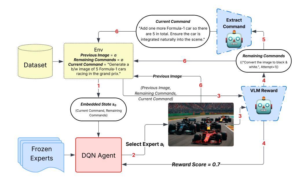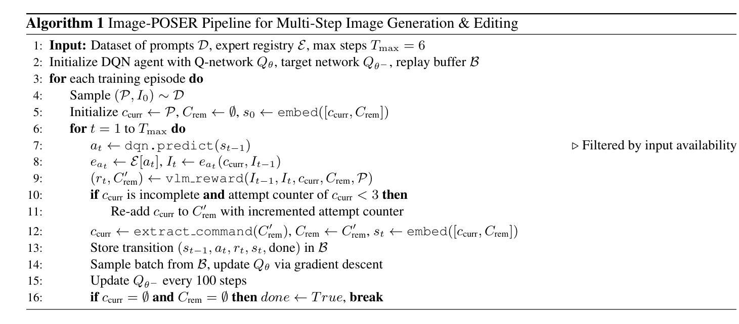 文本到图像生成的最新进展已经产生了强大的单镜头模型,然而,没有单个系统能够可靠地执行创造性工作流程中所典型的长期组合提示。我们引入了Image-POSER,这是一种反射性强化学习框架,它(i)协调了多样化的预训练文本到图像和图像到图像的专家注册,(ii)通过动态任务分解端到端地处理长形式提示,以及(iii)通过视觉语言模型批评者的结构化反馈来监督每一步的对齐。通过将图像合成和编辑作为马尔可夫决策过程,我们学习了非平凡的专家管道,这些管道能够自适应地结合各模型的优点。实验表明,在标准行业基准和自定义基准测试中,Image-POSER在对齐、保真度和美学方面的表现均优于基线模型,并在人类评估中始终受到青睐。这些结果突显了强化学习可以使AI系统具备自主分解、重新排序和组合视觉模型的能力,朝着通用视觉助理的方向发展。