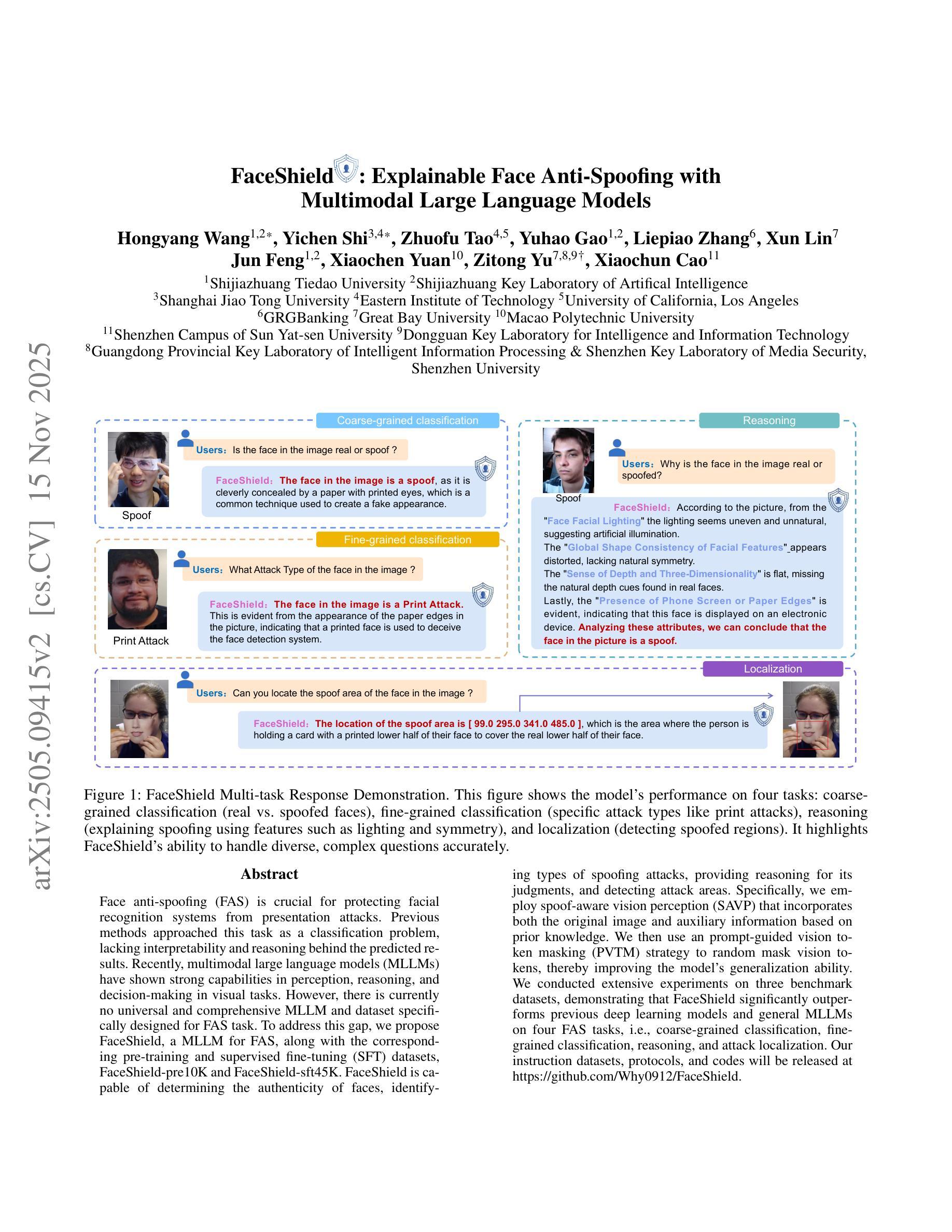 Face anti-spoofing (FAS) is crucial for protecting facial recognition systems from presentation attacks. Previous methods approached this task as a classification problem, lacking interpretability and reasoning behind the predicted results. Recently, multimodal large language models (MLLMs) have shown strong capabilities in perception, reasoning, and decision-making in visual tasks. However, there is currently no universal and comprehensive MLLM and dataset specifically designed for FAS task. To address this gap, we propose FaceShield, a MLLM for FAS, along with the corresponding pre-training and supervised fine-tuning (SFT) datasets, FaceShield-pre10K and FaceShield-sft45K. FaceShield is capable of determining the authenticity of faces, identifying types of spoofing attacks, providing reasoning for its judgments, and detecting attack areas. Specifically, we employ spoof-aware vision perception (SAVP) that incorporates both the original image and auxiliary information based on prior knowledge. We then use an prompt-guided vision token masking (PVTM) strategy to random mask vision tokens, thereby improving the model’s generalization ability. We conducted extensive experiments on three benchmark datasets, demonstrating that FaceShield significantly outperforms previous deep learning models and general MLLMs on four FAS tasks, i.e., coarse-grained classification, fine-grained classification, reasoning, and attack localization. Our instruction datasets, protocols, and codes will be released at https://github.com/Why0912/FaceShield.