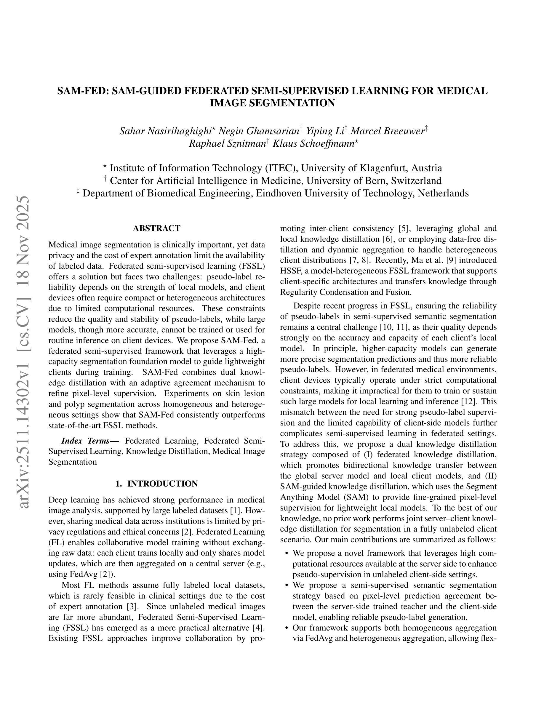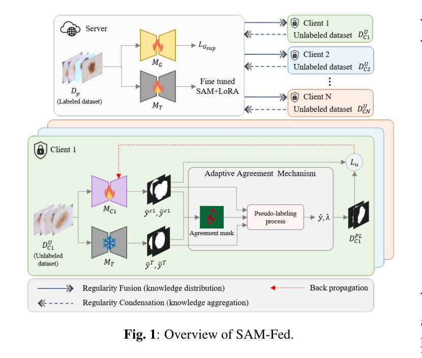 医学图像分割在临床具有重要意义,然而数据隐私和专家标注的成本限制了标记数据的可用性。联合半监督学习(FSSL)提供了解决方案,但面临两个挑战:伪标签的可靠性取决于本地模型的强度,而由于计算资源有限,客户端设备通常需要紧凑或异构架构。这些约束降低了伪标签的质量和稳定性,而大型模型虽然更准确,但不能在客户端设备进行常规推理训练或使用。我们提出了SAM-Fed,这是一个联邦半监督框架,利用高容量的分割基础模型在训练过程中引导轻量级客户端。SAM-Fed结合双知识蒸馏和自适应协议机制来优化像素级监督。在皮肤病变和息肉分割的同质和异质设置上的实验表明,SAM-Fed始终优于最新的FSSL方法。