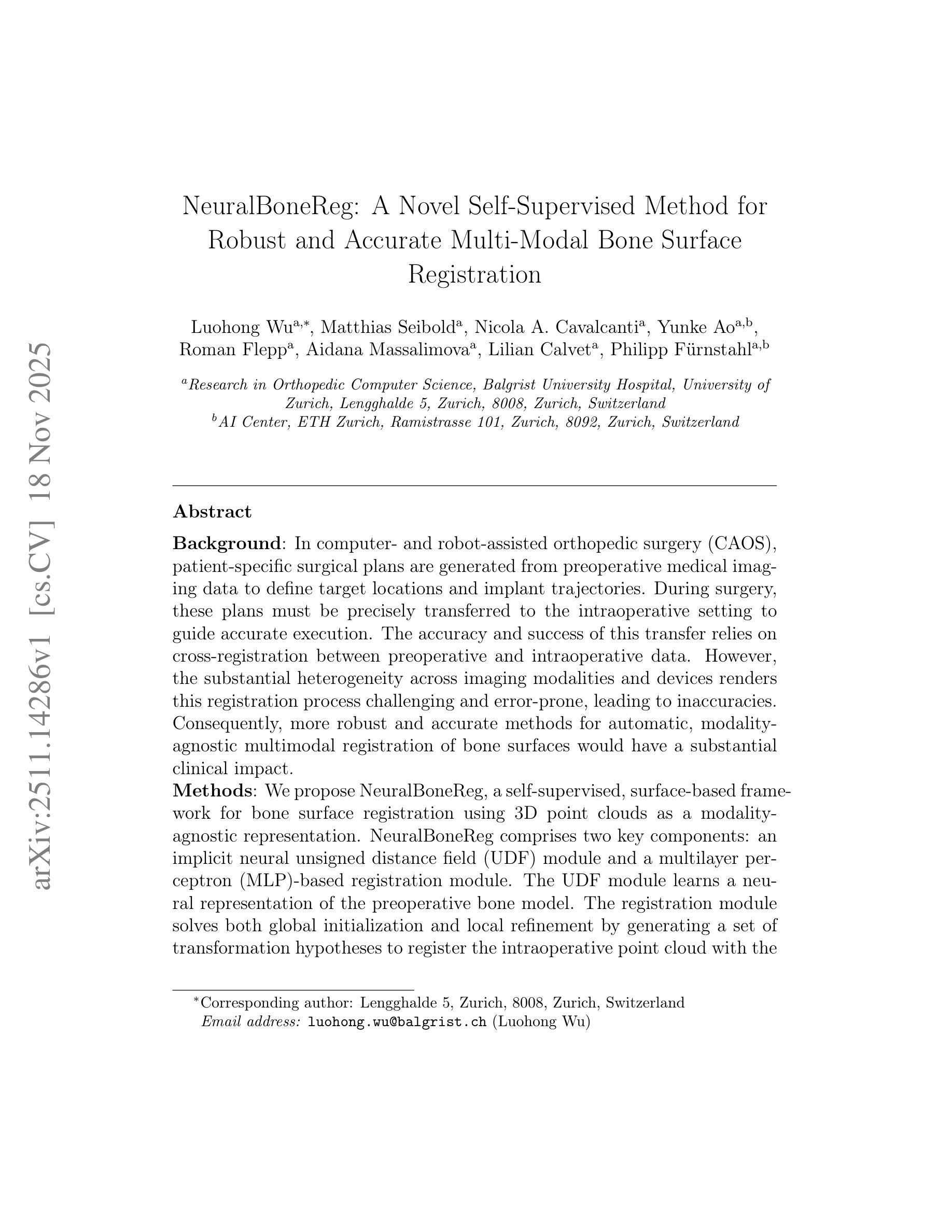 在计算机辅助骨科手术(CAOS)中,根据术前成像制定的患者特异性手术计划定义了目标位置和植入物轨迹。在手术过程中,必须准确传输这些计划,这依赖于术前和术中数据之间的精确跨注册。然而,不同成像方式之间的模态异质性使得这种注册具有挑战性和易出错。因此,稳健、自动、与模态无关的骨表面注册在临床上具有重要意义。我们提出了NeuralBoneReg,这是一个基于自监督、基于表面的框架,使用3D点云作为与模态无关的表示来注册骨表面。NeuralBoneReg包括两个模块:一个隐式神经网络无符号距离场(UDF),用于学习术前骨模型,一个基于多层感知器(MLP)的注册模块,通过生成转换假设来执行全局初始化和局部细化,以将术中点云与神经UDF对齐。与最先进的监督方法不同,NeuralBoneReg采用自监督方式运行,无需跨主体训练数据。我们在两个公开可用的多模式数据集上对NeuralBoneReg与基准方法进行了评估:腓骨和胫骨的CT-超声数据集(UltraBones100k)和脊椎骨的CT-RGB-D数据集(SpineDepth)。评估还包括新引入的包含股骨和骨盆的尸检CT-超声数据集(UltraBones-Hip),该数据集将公开提供。NeuralBoneReg在所有数据集上均达到或超越了现有方法,在UltraBones100k上的平均RRE/RTE为1.68°/1.86毫米,在UltraBones-Hip上为1.88°/1.89毫米,在SpineDepth上为3.79°/2.45毫米。这些结果证明了在不同解剖结构和模态下的强大通用性,为CAOS提供了稳健而准确的跨模态对齐。
