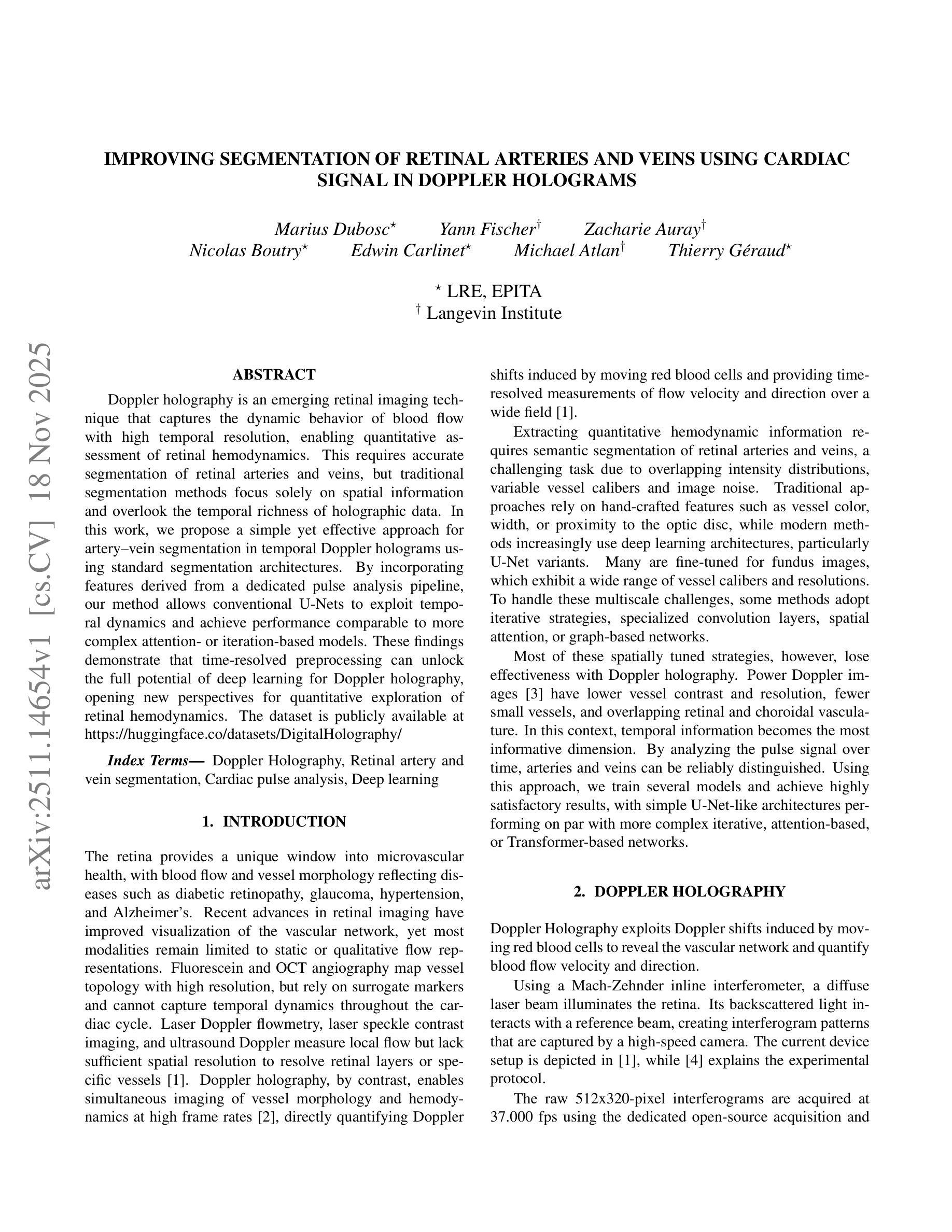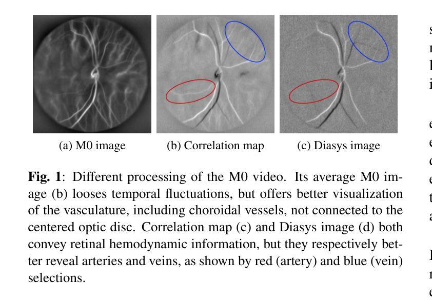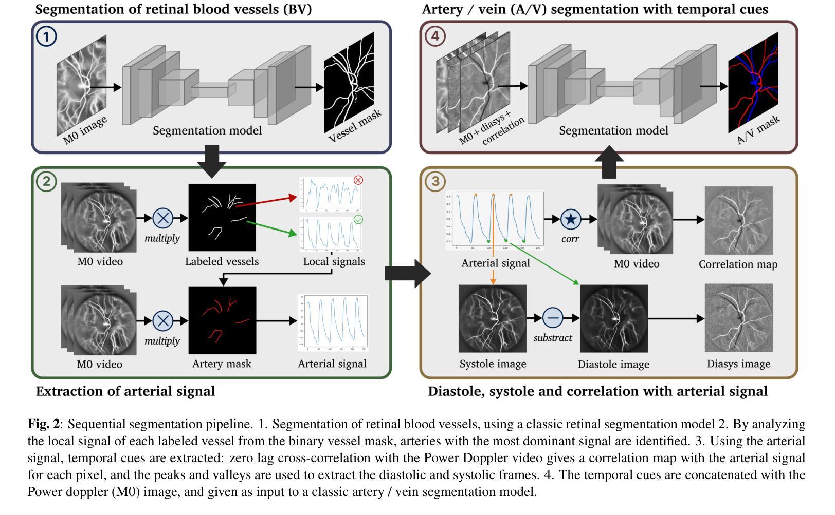 多普勒全息术是一种新兴的视网膜成像技术,能捕捉血流的动态行为,具有高的时间分辨率,可以对视网膜血流动力学进行定量评估。本文提出了一种简单有效的动脉静脉分割方法,该方法结合标准分割架构并利用脉冲分析管道的特征,允许传统的U-Net利用时间动态信息,实现与更复杂基于注意力或迭代模型的性能相当。这为多普勒全息术深度学习解锁了潜力,为视网膜血流动力学的定量研究提供了新的视角。