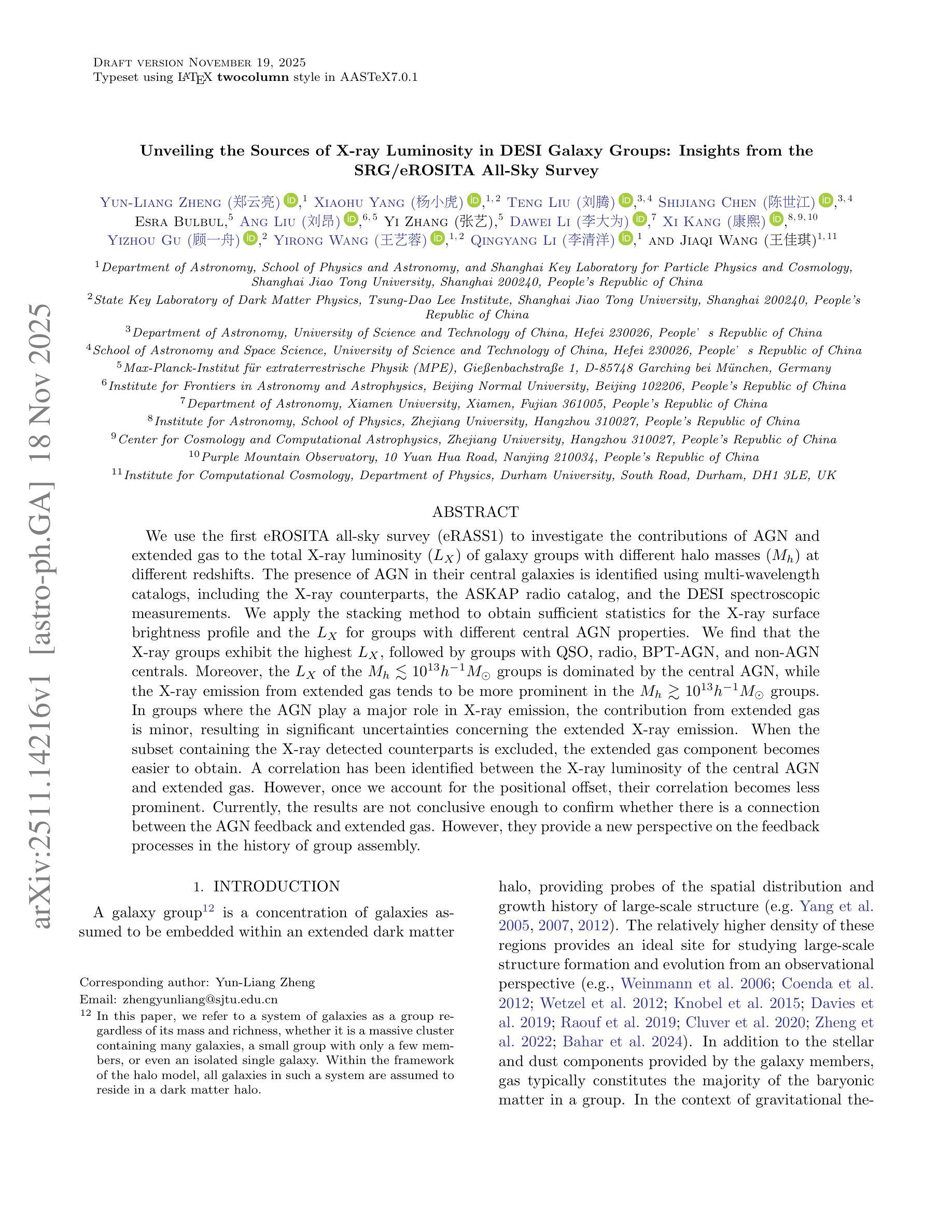 我们利用eROSITA首次全天空调查(eRASS1)来研究活动星系核(AGN)和延展气体对不同红移下不同晕质量(Mh)星系群总X射线光度(Lx)的贡献。通过多波段目录,包括X射线对应体、ASKAP射电目录和DESI光谱测量,确定了其中心星系中活动星系核的存在。我们应用叠加方法获得不同中心活动星系核属性的星系的X射线表面亮度分布和Lx的足够统计数据。我们发现,X射线星系的Lx最高,其次是具有类星体、射电、BPT-AGN和非活动星系核的中心星系。此外,对于Mh小于或等于10^13h^-1M_⊙的星系群来说,中心活动星系核对Lx的贡献占主导地位,而延展气体的X射线发射在Mh大于或等于10^13h^-1M_⊙的星系群中更为突出。在中心活动星系核对X射线发射起主要作用的星系群中,延展气体的贡献较小,导致延展X射线发射存在重大不确定性。当排除包含X射线检测对应体的子集时,更容易获得延展气体成分。中央活动星系核的X射线光度和延展气体之间已经发现了一定的相关性。然而,一旦考虑到位置偏移,它们之间的关联就变得不那么显著。目前的结果尚不足以确定活动星系核反馈与延展气体之间是否存在联系。然而,这为研究星系团形成过程中的反馈过程提供了新的视角。