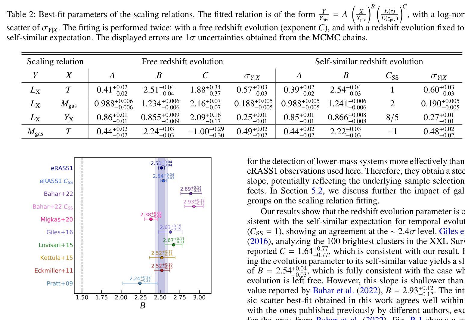 eROSITA望远镜在SRG任务上观察到迄今为止最大的星系团集群样本,通过其团内/组内介质发射检测得到。分析这些系统的内在属性之间的标度关系,为理解它们的形成和演化提供了宝贵见解。研究团队探究了软X射线光度、温度、气体质量等关键物理属性之间的标度关系,以及第一个eROSITA全天巡天得到的星系团样本的低散射质量代理Yx。该样本跨越了红移范围0.05<z<1.07和质量范围,代表了迄今为止用于标度关系分析的最大样本。研究团队将选择函数纳入模型中,并报告了一系列最佳拟合参数。结果表明,标度关系的斜率与自相似预期存在显著差异,而红移演化则与自相似模型一致。