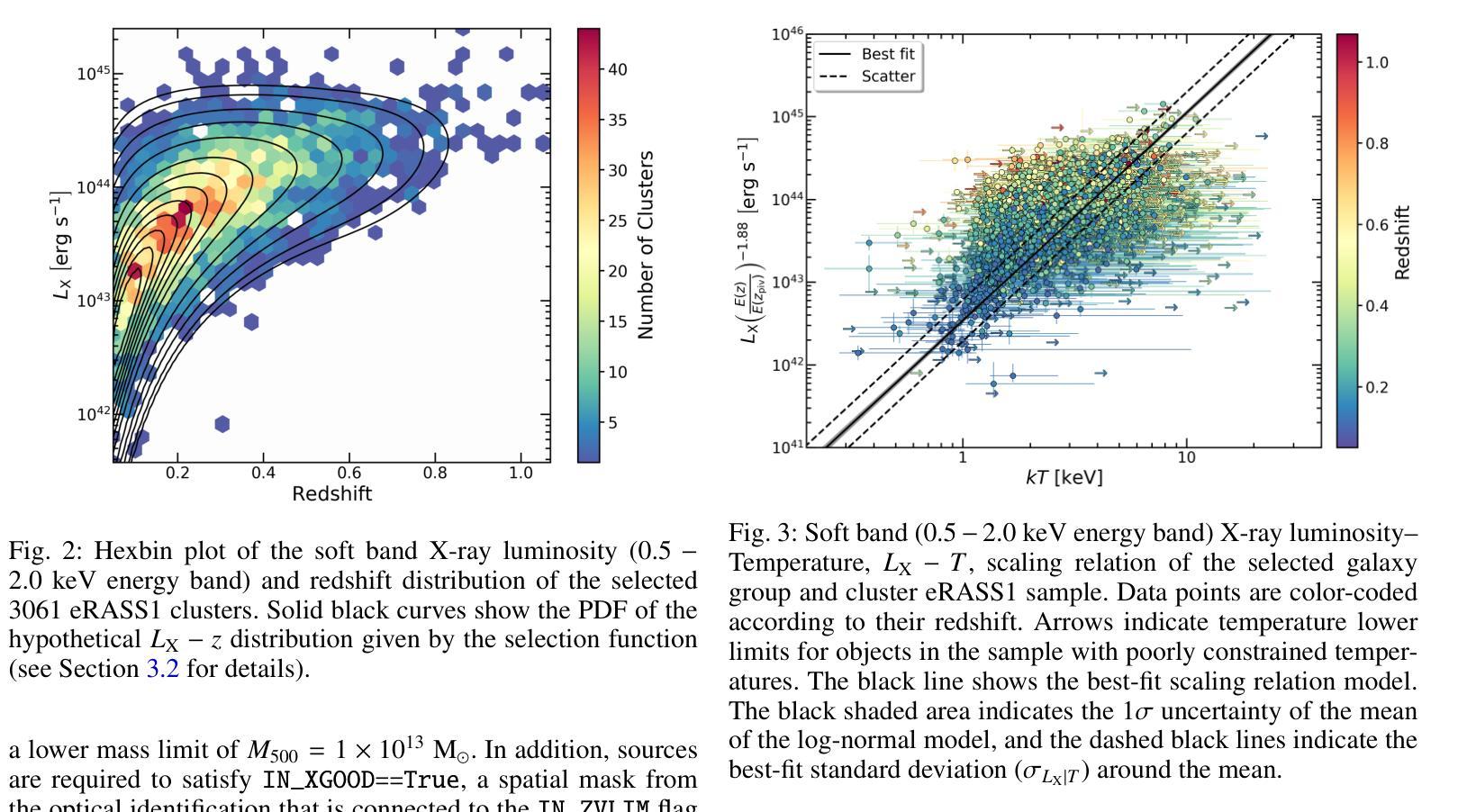 - 利用eROSITA全天图首次调查研究了不同中心星系的活动星系核(AGN)和延展气体对星系团总X射线光度的贡献。