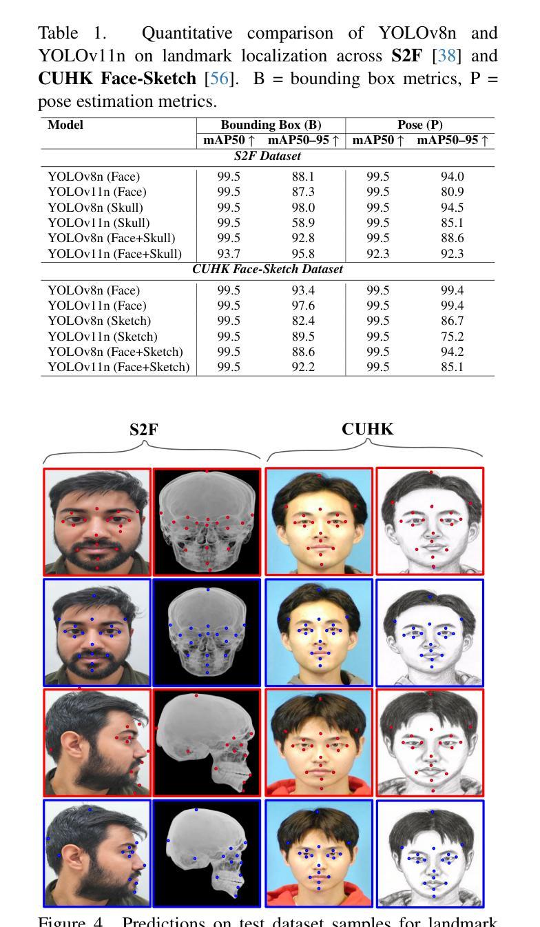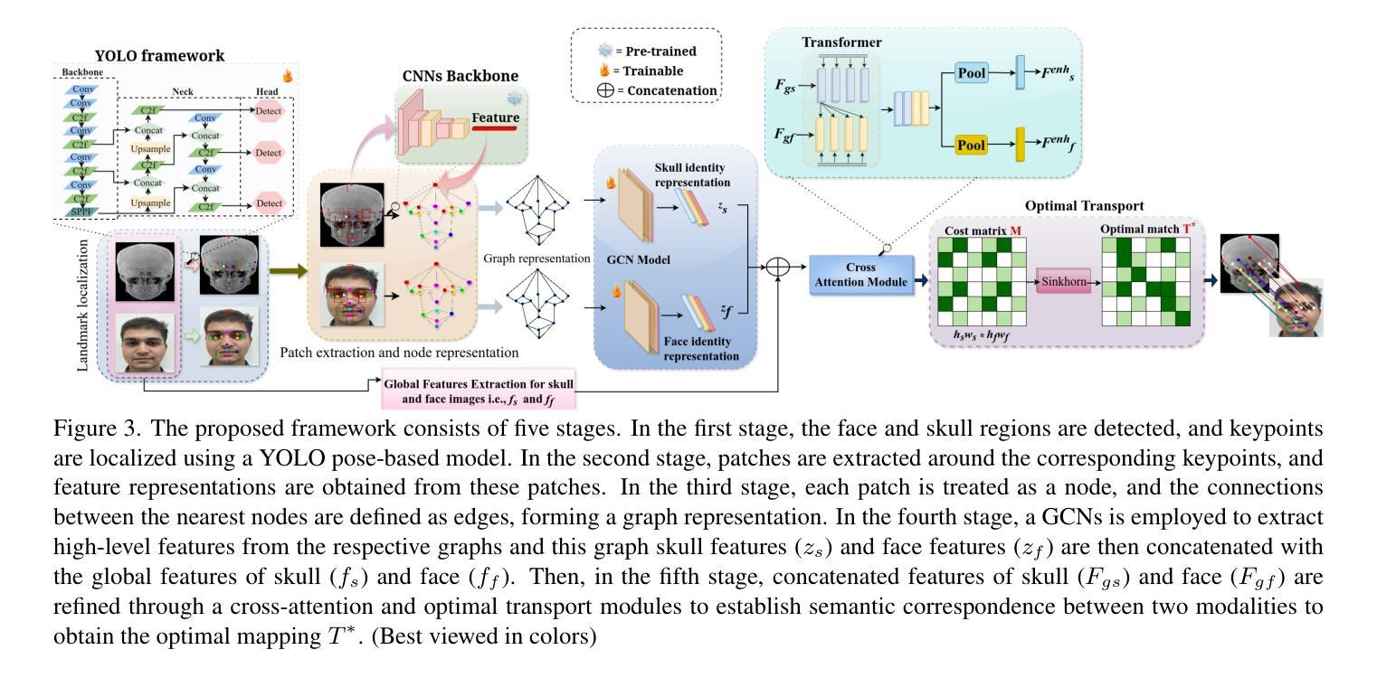 在法医学颅面部识别以及许多生物医学应用中,颅面测量地标非常重要。传统地标定位方法耗时,需要专业知识和专门知识。目前的方法采用叠加和基于深度学习的方法,对地标进行自动标注。然而,由于缺乏大规模验证研究,这些方法并不可靠。在本文中,我们提出了一种新型框架Cranio-ID:首先,使用我们训练的YOLO-pose模型对二维颅骨(面部X射线扫描)及其相应的光学图像进行地标自动标注。其次,通过将这些地标转化为图形表示,然后在两种模态的图形之间找到语义对应关系,使用跨注意力和最优传输框架实现跨模态匹配。我们的提议框架在S2F和CUHK数据集上进行了验证(CUHK数据集与S2F数据集相似)。已经进行了大量实验来评估我们提议框架的性能,它在可靠性和准确性方面显示出显着提高,并且在法医学中的跨域颅骨对面部以及草图对面部的匹配中非常有效。