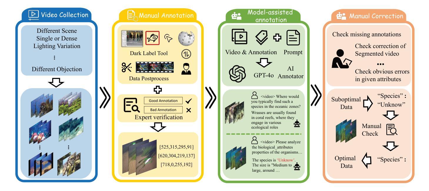 最近,大型语言模型(LLM)的显著成功对人工智能领域产生了深远影响。基于LLM的许多先进作品已经被提出并应用于各种场景。其中,视频语言模型(VidLMs)的应用尤为广泛。然而,现有的工作主要集中在地面场景,忽视了水下观察的高需求应用。为了弥补这一差距,我们引入了UVLM,这是一个水下观察基准测试,它是通过结合人类专业知识和AI模型的方法协同构建的。为了确保数据质量,我们从多个角度进行了深入考虑。首先,为了应对水下环境的独特挑战,我们选择了代表典型水下挑战的视频来构建数据集,这些挑战包括光线变化、水质混浊和多样化的观看角度。其次,为了确保数据多样性,数据集涵盖了广泛的帧率、分辨率、419类海洋生物以及各种各样的静态植物和地形。接下来,为了任务多样性,我们采用了结构化设计,将观察目标分为两大类:生物类和环境类。每个类别都包括内容观察和变化/动作观察,总计20种不同的任务类型。最后,我们设计了一些具有挑战性的评估指标,以便对不同方法进行定量比较和分析。在两个具有代表性的VidLM上的实验表明,在UVLM上对VidLM进行微调可以显著提高对水下世界的理解,同时也显示出对现有的空中VidLM基准测试(如VideoMME和Perception text)的轻微改进潜力。数据集和提示工程将公开发布。