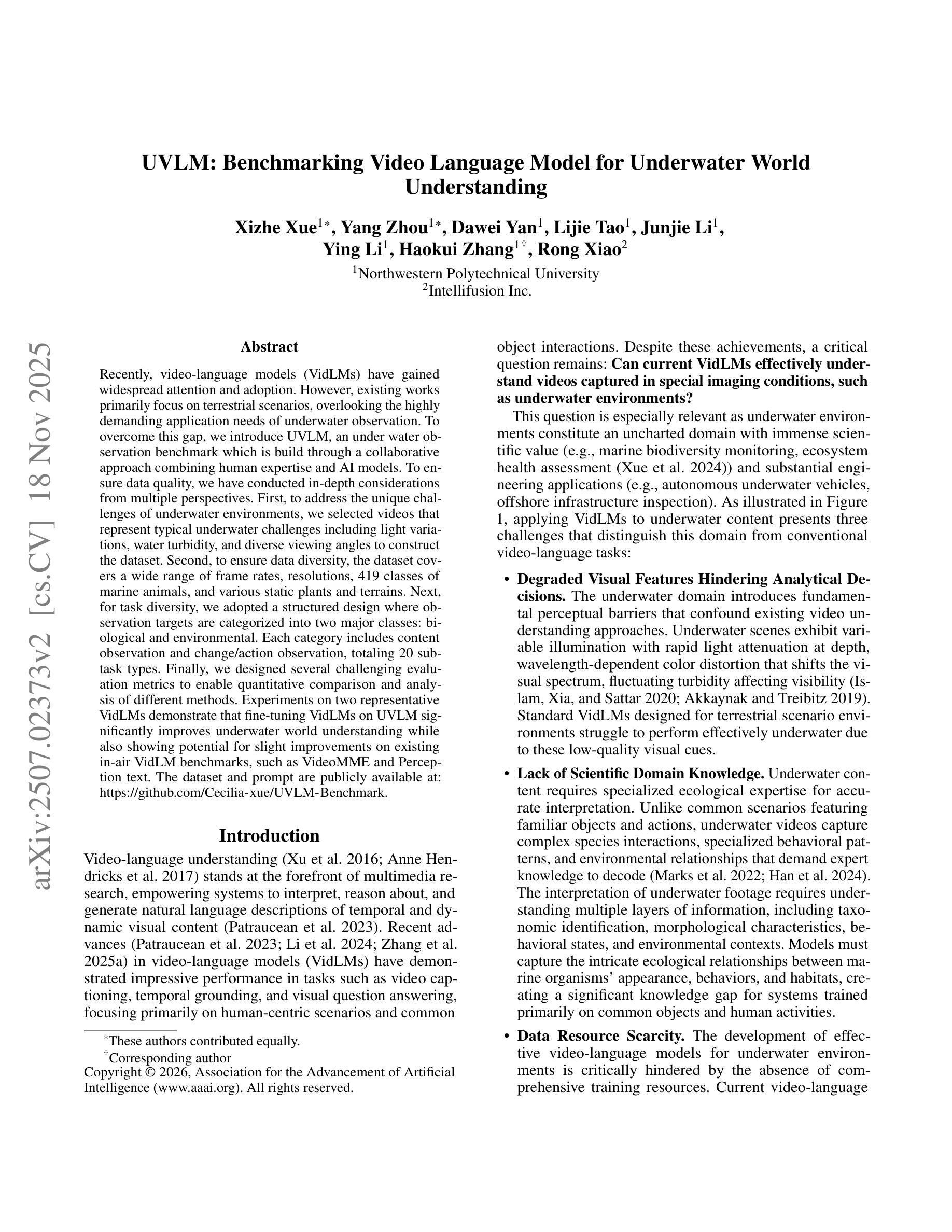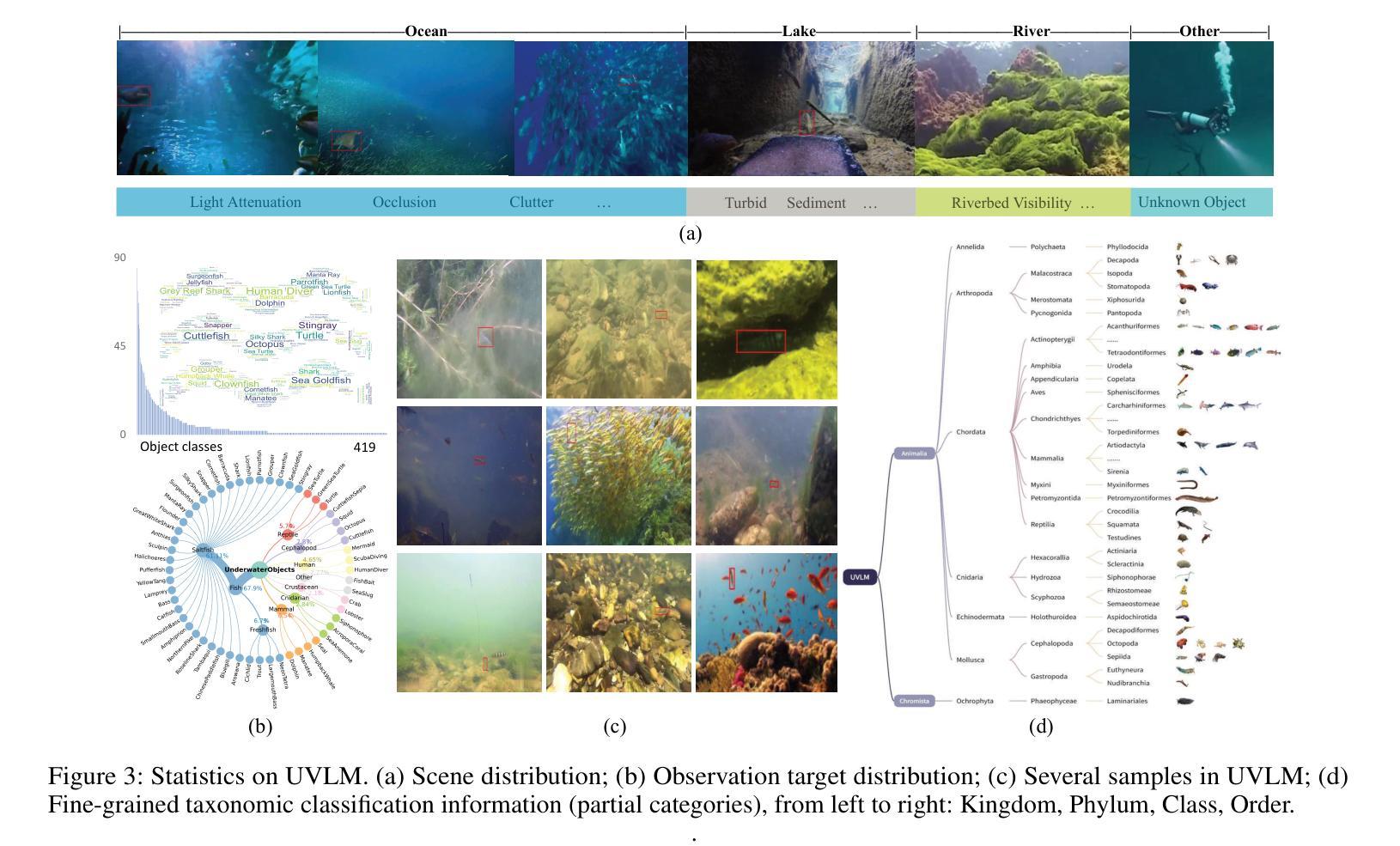 - UVLM是一个通过人类专家与AI模型协作构建的水下观察基准测试,解决水下环境的独特挑战。