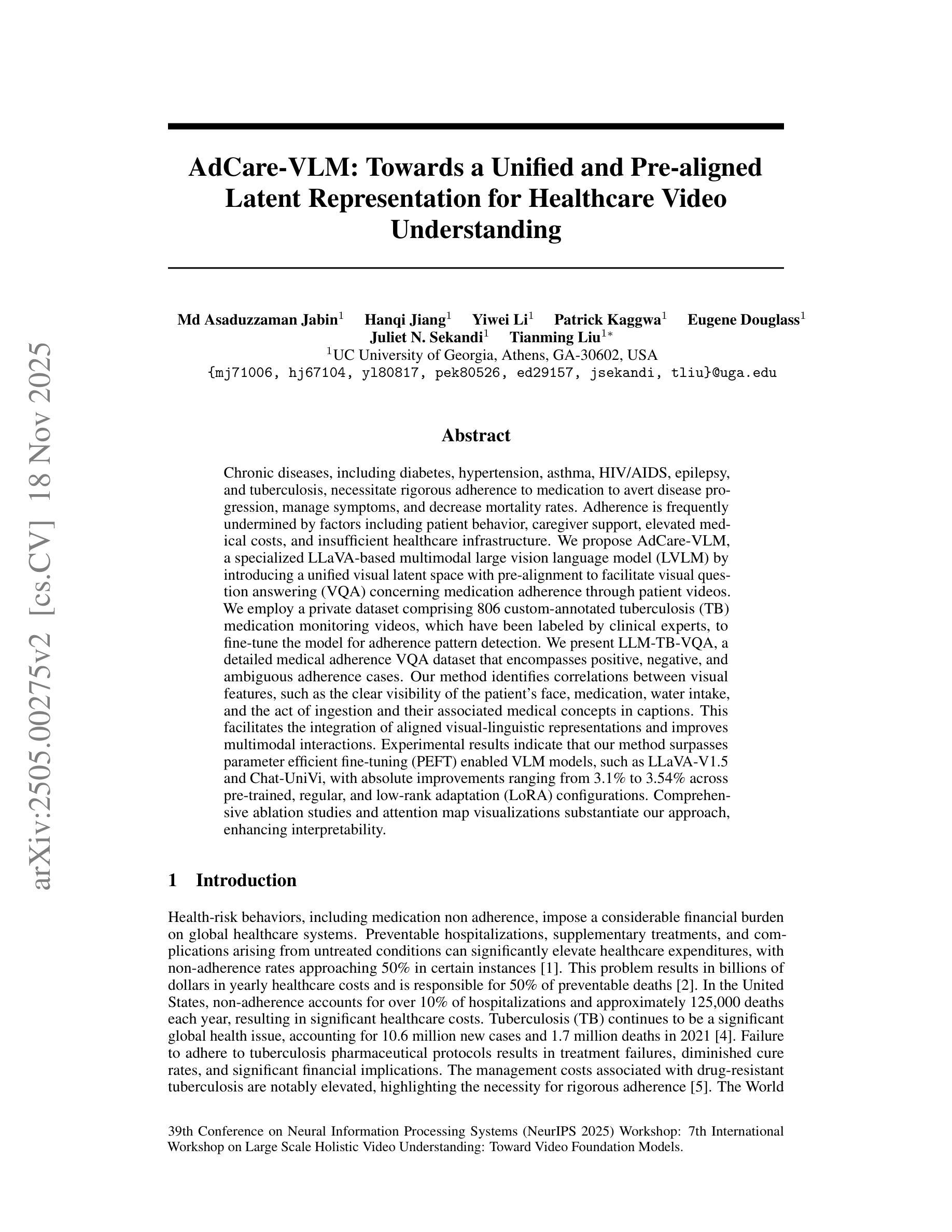 Chronic diseases, including diabetes, hypertension, asthma, HIV-AIDS, epilepsy, and tuberculosis, necessitate rigorous adherence to medication to avert disease progression, manage symptoms, and decrease mortality rates. Adherence is frequently undermined by factors including patient behavior, caregiver support, elevated medical costs, and insufficient healthcare infrastructure. We propose AdCare-VLM, a specialized LLaVA-based multimodal large vision language model (LVLM) by introducing a unified visual latent space with pre-alignment to facilitate visual question answering (VQA) concerning medication adherence through patient videos. We employ a private dataset comprising 806 custom-annotated tuberculosis (TB) medication monitoring videos, which have been labeled by clinical experts, to fine-tune the model for adherence pattern detection. We present LLM-TB-VQA, a detailed medical adherence VQA dataset that encompasses positive, negative, and ambiguous adherence cases. Our method identifies correlations between visual features, such as the clear visibility of the patient’s face, medication, water intake, and the act of ingestion, and their associated medical concepts in captions. This facilitates the integration of aligned visual-linguistic representations and improves multimodal interactions. Experimental results indicate that our method surpasses parameter-efficient fine-tuning (PEFT) enabled VLM models, such as LLaVA-V1.5 and Chat-UniVi, with absolute improvements ranging from 3.1% to 3.54% across pre-trained, regular, and low-rank adaptation (LoRA) configurations. Comprehensive ablation studies and attention map visualizations substantiate our approach, enhancing interpretability.