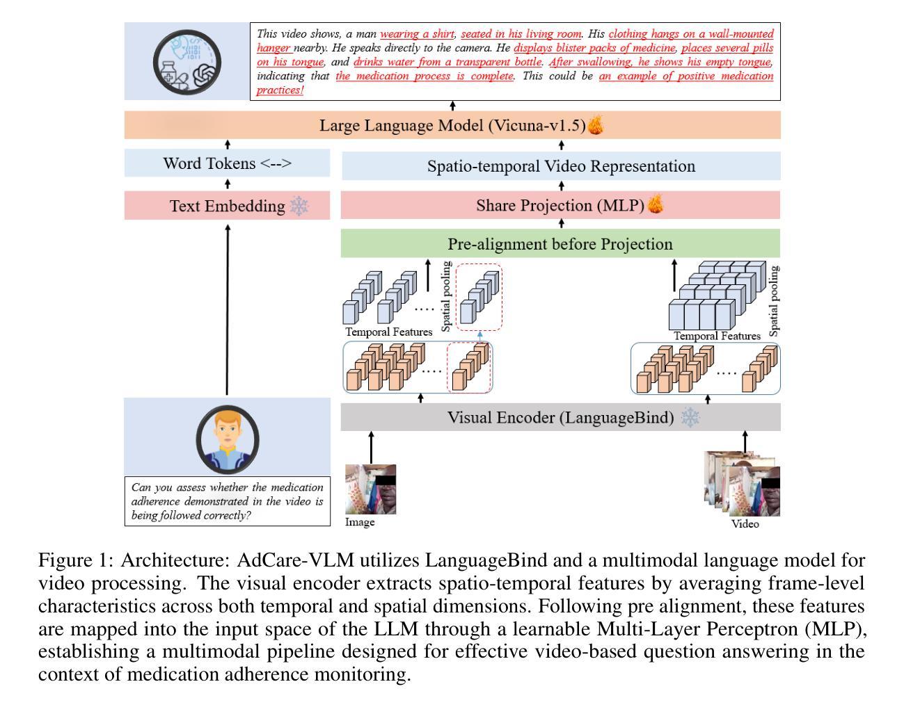 慢性病,包括糖尿病、高血压、哮喘、艾滋病、癫痫和肺结核,需要严格遵循药物治疗以避免疾病进展、管理症状和降低死亡率。患者的行为、护理人员的支持、医疗成本高昂和医疗保健基础设施不足等因素经常破坏遵医嘱行为。我们提出AdCare-VLM,这是一种基于LLaVA的多模式大型视觉语言模型(LVLM),通过引入统一视觉潜在空间并进行预对齐,以促进通过患者视频进行药物治疗依从性相关的视觉问答(VQA)。我们使用包含806个由临床专家标注的肺结核(TB)药物治疗监控视频的私有数据集,对模型进行微调,以检测依从性模式。我们提供了详细的医疗依从性VQA数据集LLM-TB-VQA,涵盖积极、消极和模棱两可的依从性情况。我们的方法能够识别诸如患者面部、药物、饮水摄入和服药行为的视觉特征,以及与说明中的相关医学概念之间的关联。这有助于整合对齐的视觉语言表示,提高多模式交互。实验结果表明,我们的方法在预训练、常规和低秩适应(LoRA)配置中,超越了参数有效微调(PEFT)启用的VLM模型,如LLaVA-V1.5和Chat-UniVi,绝对改进范围在3.1%至3.54%之间。全面的消融研究和注意力图可视化证实了我们方法的有效性,提高了可解释性。