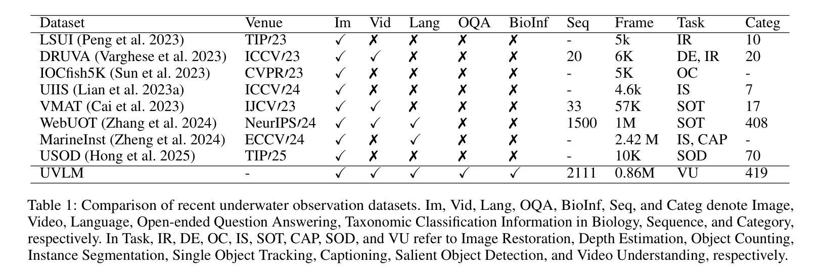 - UVLM数据集确保了数据质量和多样性,包括帧率、分辨率、海洋生物类别等。