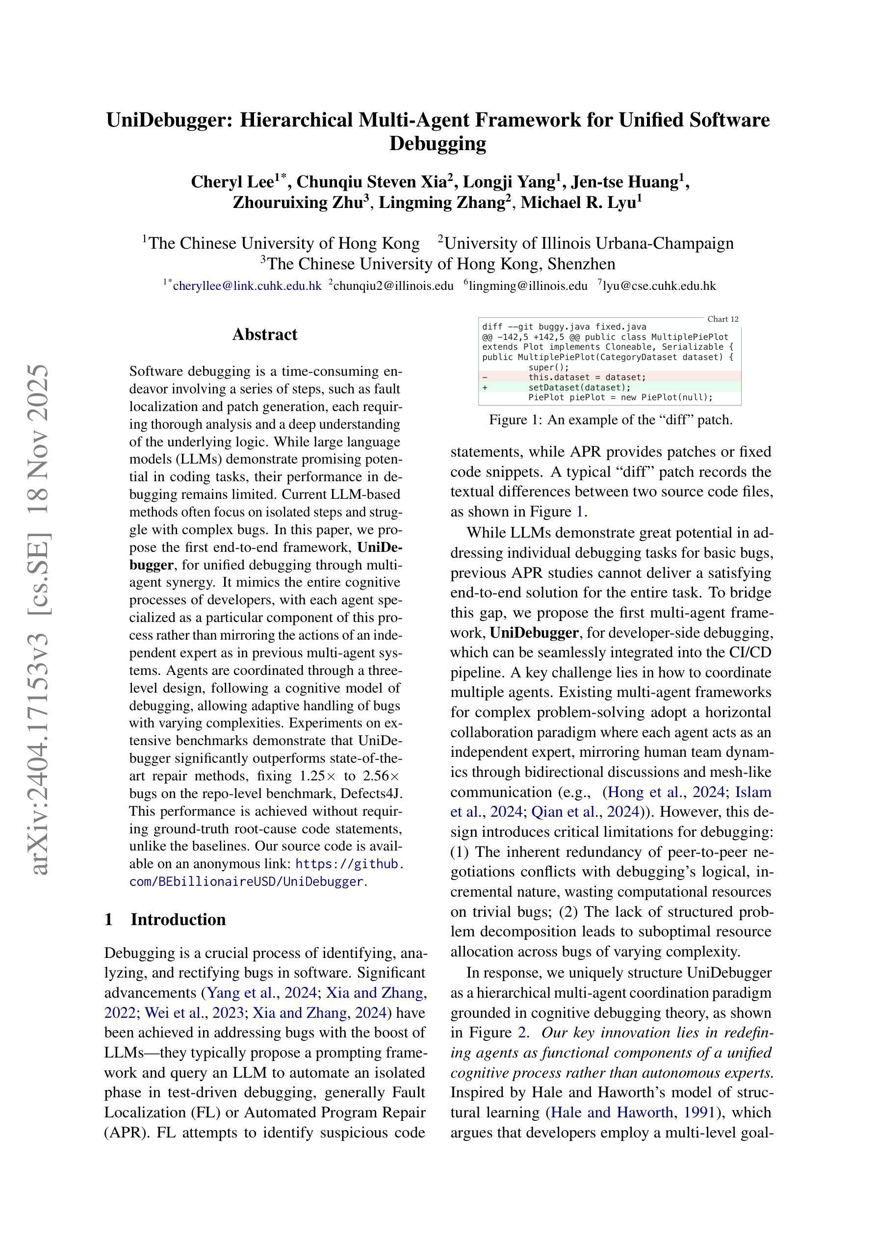 软件调试是一项耗时的工作,包含故障定位和补丁生成等多个步骤,需要深入分析并深刻理解底层逻辑。尽管大型语言模型在编码任务中展现出潜力,但在调试方面的表现仍然有限。当前基于大型语言模型的调试方法往往侧重于单个步骤,难以处理复杂错误。本文提出首个端到端的框架FixAgent,通过多智能体协同实现统一调试。它模仿开发者的整个认知过程,每个智能体作为这一过程的特定组件而不是独立专家的行动来发挥作用。智能体通过遵循调试的认知模型的三级设计进行协调,能够自适应处理不同复杂度的错误。在广泛的基准测试上进行的实验表明,FixAgent显著优于最新的修复方法,在repo级别的基准测试Defects4J上修复了1.25至2.56倍的错误。最重要的是,它不需要像基线方法那样依赖真实原因的代码语句。