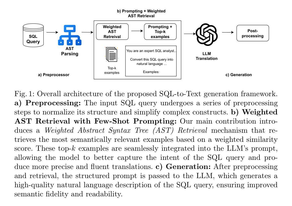SQL-to-Text生成旨在将结构化SQL查询翻译为自然语言描述,从而帮助非技术用户理解复杂的数据库操作。尽管大型语言模型(LLM)最近表现出了令人鼓舞的结果,但当前的方法往往无法保持SQL查询的确切语义,特别是在有多种可能的正确表述时。为了解决这个问题,我们的工作提出了加权抽象语法树(AST)检索与提示方法,这是一种结合了结构化查询表示和LLM提示的架构。该方法使用基于抽象语法树(AST)的相似度度量以及学习到的特征权重,检索少量语义相关的示例作为提示。我们的结构感知提示技术确保生成的描述既流畅又忠于原始查询逻辑。在Spider、SParc和CoSQL三个基准数据集上的大量实验表明,我们的方法在执行准确性(EX)方面比当前基线高出+17.24%,在精确匹配(EM)方面表现更优,同时在人类评估时提供更一致的语义保真度,同时保持竞争力水平的运行性能。这些结果表明,加权AST提示是一种可从结构化数据库查询中导出自然语言解释的可扩展且有效的方法。