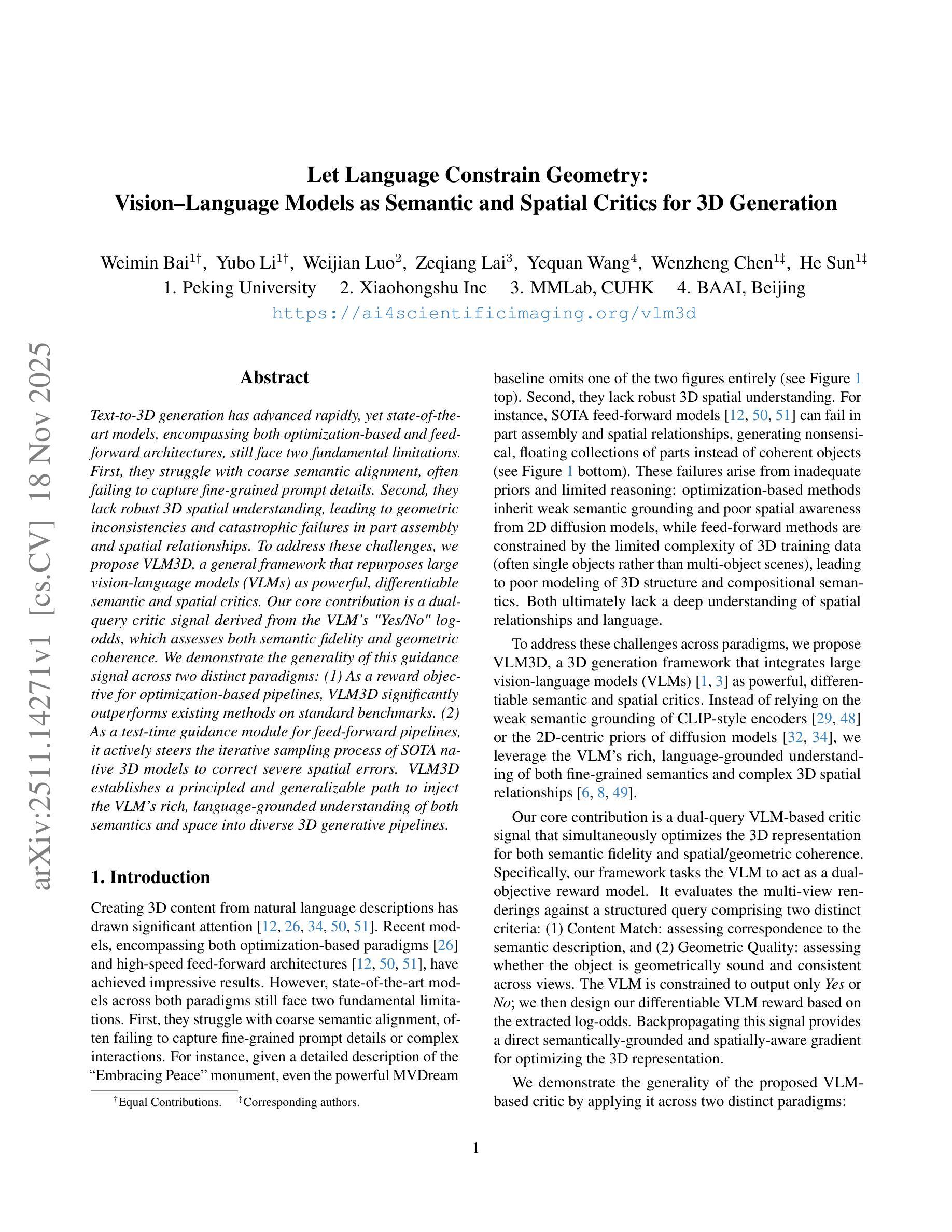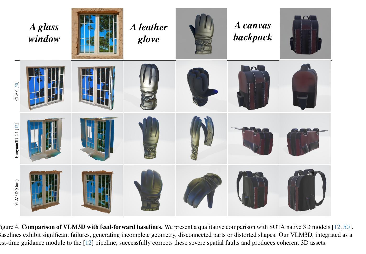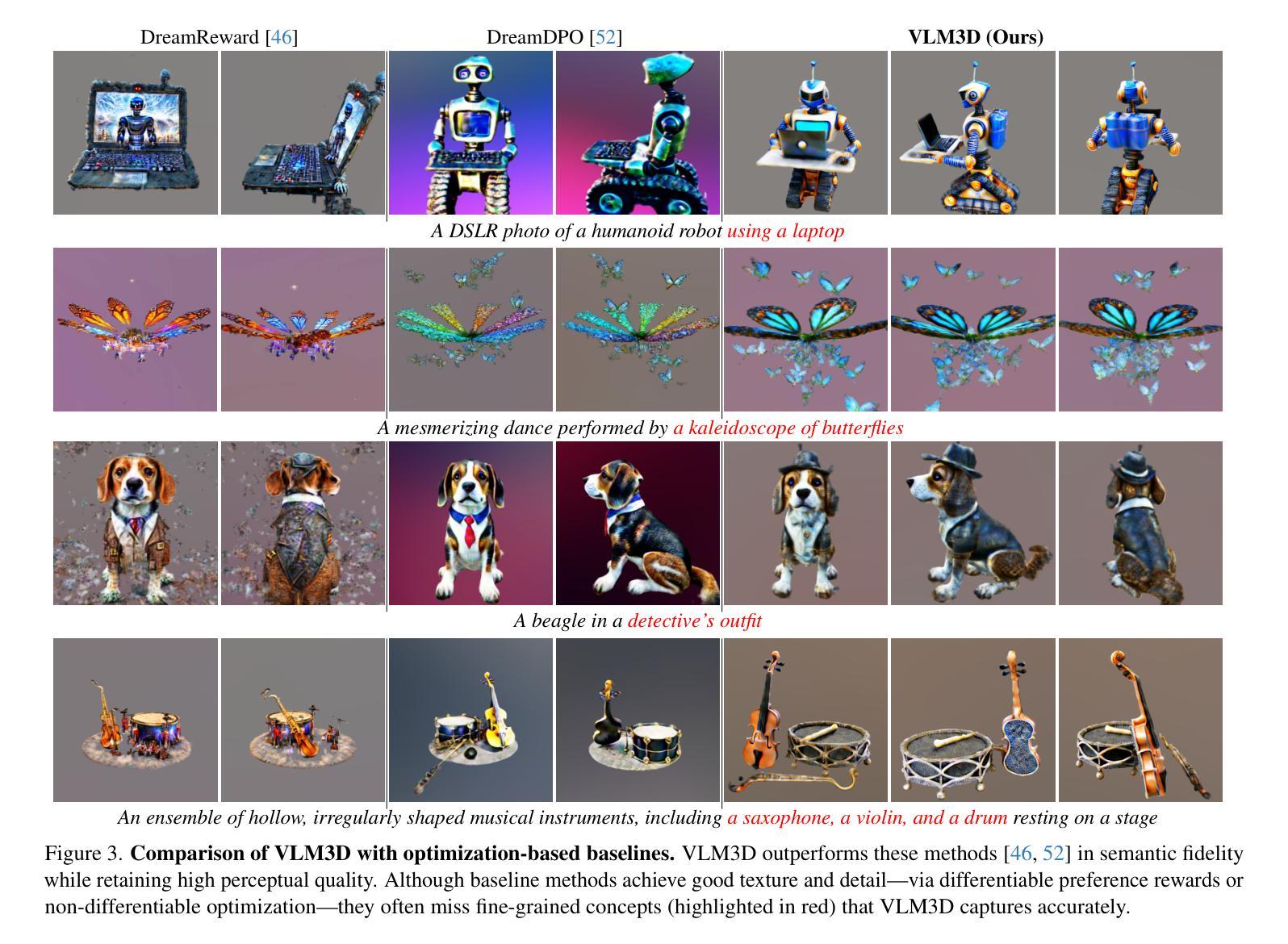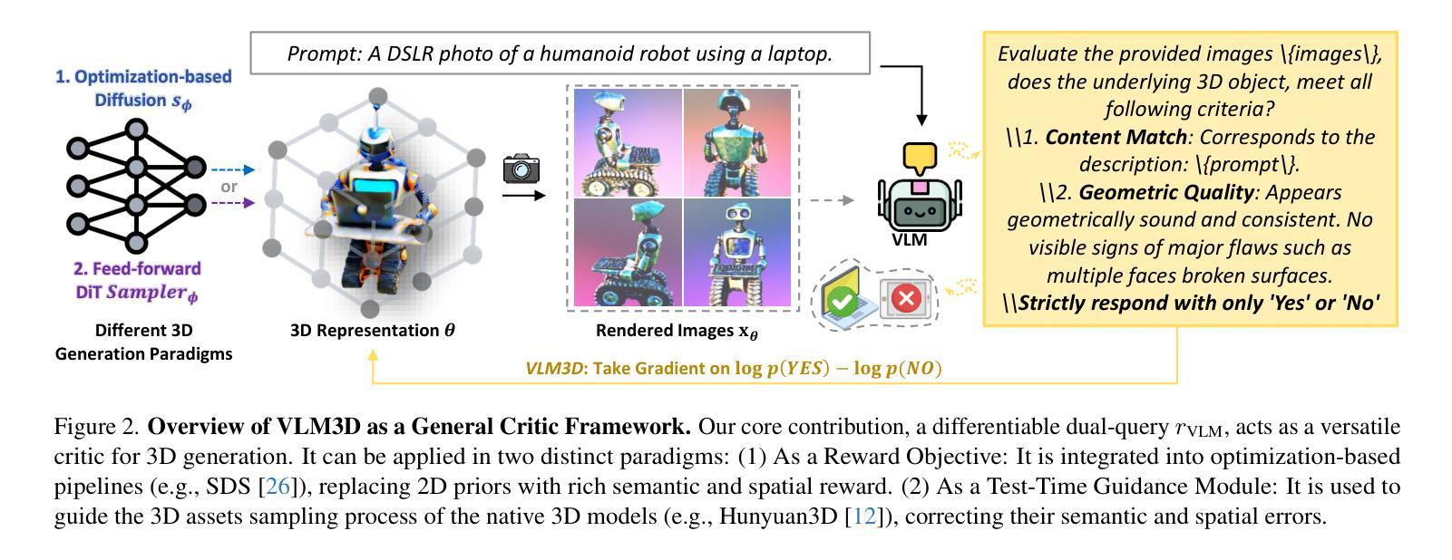 文本到3D生成的转换技术已经迅速发展,然而,包括基于优化和前馈架构的最先进模型仍然面临两个基本局限。首先,它们在进行粗略语义对齐时遇到困难,往往无法捕捉精细的提示细节。其次,它们缺乏强大的3D空间理解能力,导致几何不一致以及在部件组装和空间关系方面的灾难性失败。为了解决这些挑战,我们提出了VLM3D,这是一个通用框架,它重新利用大型视觉语言模型(VLM)作为强大且可区分的语义和空间批判者。我们的核心贡献是源于VLM的“是”或“否”对数几率的双查询批判信号,它评估语义保真度和几何一致性。我们证明了这种指导信号在两种不同范式下的普遍性:(1)作为基于优化的管道奖励目标时,VLM3D在标准基准测试上的表现显著优于现有方法;(2)作为前馈管道的测试时间指导模块时,它主动引导最新本地3D模型的迭代采样过程以纠正严重的空间错误。VLM3D建立了一条有原则且可推广的途径,将VLM对语义和空间的丰富、基于语言的理解注入到多样化的3D生成管道中。