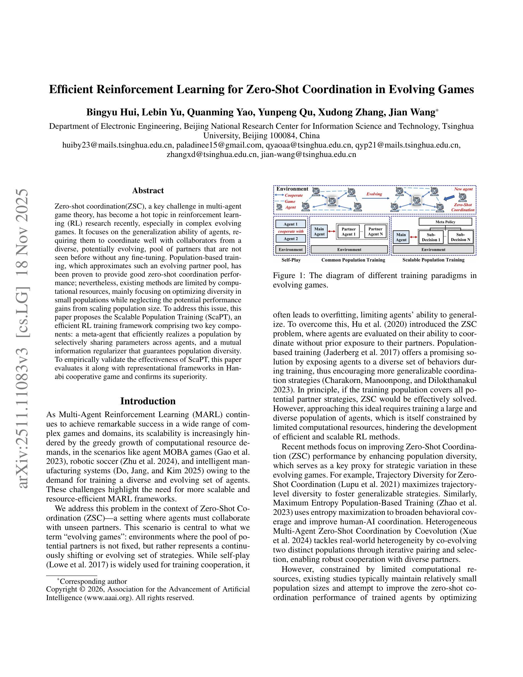 零镜头协调(ZSC)是多智能体博弈理论中的一项关键挑战,最近已成为强化学习(RL)研究中的热点话题,特别是在复杂演化游戏中。它关注智能体的泛化能力,要求它们与来自多样化的、可能不断演化的伙伴池中的合作者进行良好协调,而无需进行任何微调即可适应之前未见过的伙伴。基于种群训练的方法近似于这种不断演变的伙伴池,已被证明可以提供良好的零镜头协调性能;然而,现有方法受限于计算资源,主要集中在优化小种群中的多样性,而忽略了扩大种群规模可能带来的潜在性能提升。针对这一问题,本文提出了可扩展种群训练(ScaPT),这是一种高效的RL训练框架,包含两个关键组成部分:一种元智能体,它通过选择性共享参数有效地实现种群,以及一个保证种群多样性的互信息调节器。为了实证验证ScaPT的有效性,本文在Hanabi合作游戏中对其进行了评估,并与其他代表性框架进行了比较,证实了其优越性。