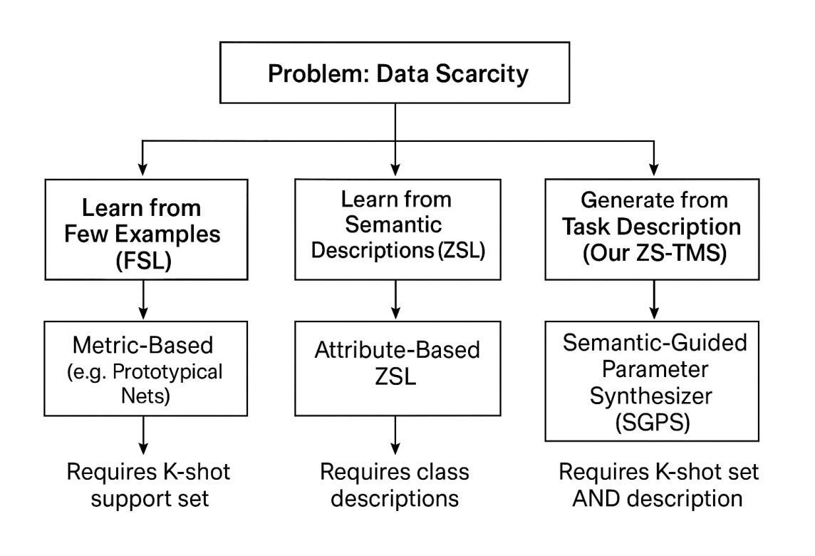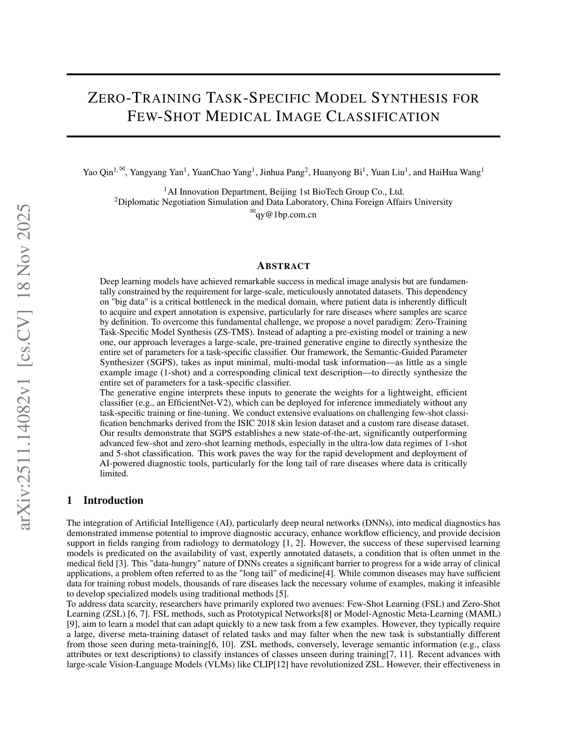 Deep learning models have achieved remarkable success in medical image analysis but are fundamentally constrained by the requirement for large-scale, meticulously annotated datasets. This dependency on “big data” is a critical bottleneck in the medical domain, where patient data is inherently difficult to acquire and expert annotation is expensive, particularly for rare diseases where samples are scarce by definition. To overcome this fundamental challenge, we propose a novel paradigm: Zero-Training Task-Specific Model Synthesis (ZS-TMS). Instead of adapting a pre-existing model or training a new one, our approach leverages a large-scale, pre-trained generative engine to directly synthesize the entire set of parameters for a task-specific classifier. Our framework, the Semantic-Guided Parameter Synthesizer (SGPS), takes as input minimal, multi-modal task information as little as a single example image (1-shot) and a corresponding clinical text description to directly synthesize the entire set of parameters for a task-specific classifier. The generative engine interprets these inputs to generate the weights for a lightweight, efficient classifier (e.g., an EfficientNet-V2), which can be deployed for inference immediately without any task-specific training or fine-tuning. We conduct extensive evaluations on challenging few-shot classification benchmarks derived from the ISIC 2018 skin lesion dataset and a custom rare disease dataset. Our results demonstrate that SGPS establishes a new state-of-the-art, significantly outperforming advanced few-shot and zero-shot learning methods, especially in the ultra-low data regimes of 1-shot and 5-shot classification. This work paves the way for the rapid development and deployment of AI-powered diagnostic tools, particularly for the long tail of rare diseases where data is critically limited.