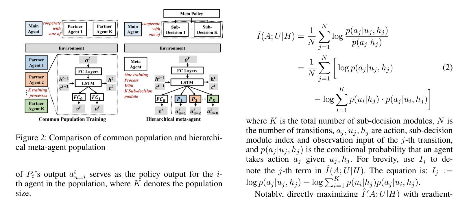 - 本文提出可扩展人口训练(ScaPT)框架以解决计算资源问题。包括选择性共享参数的元代理和保证种群多样性的相互信息调节器。