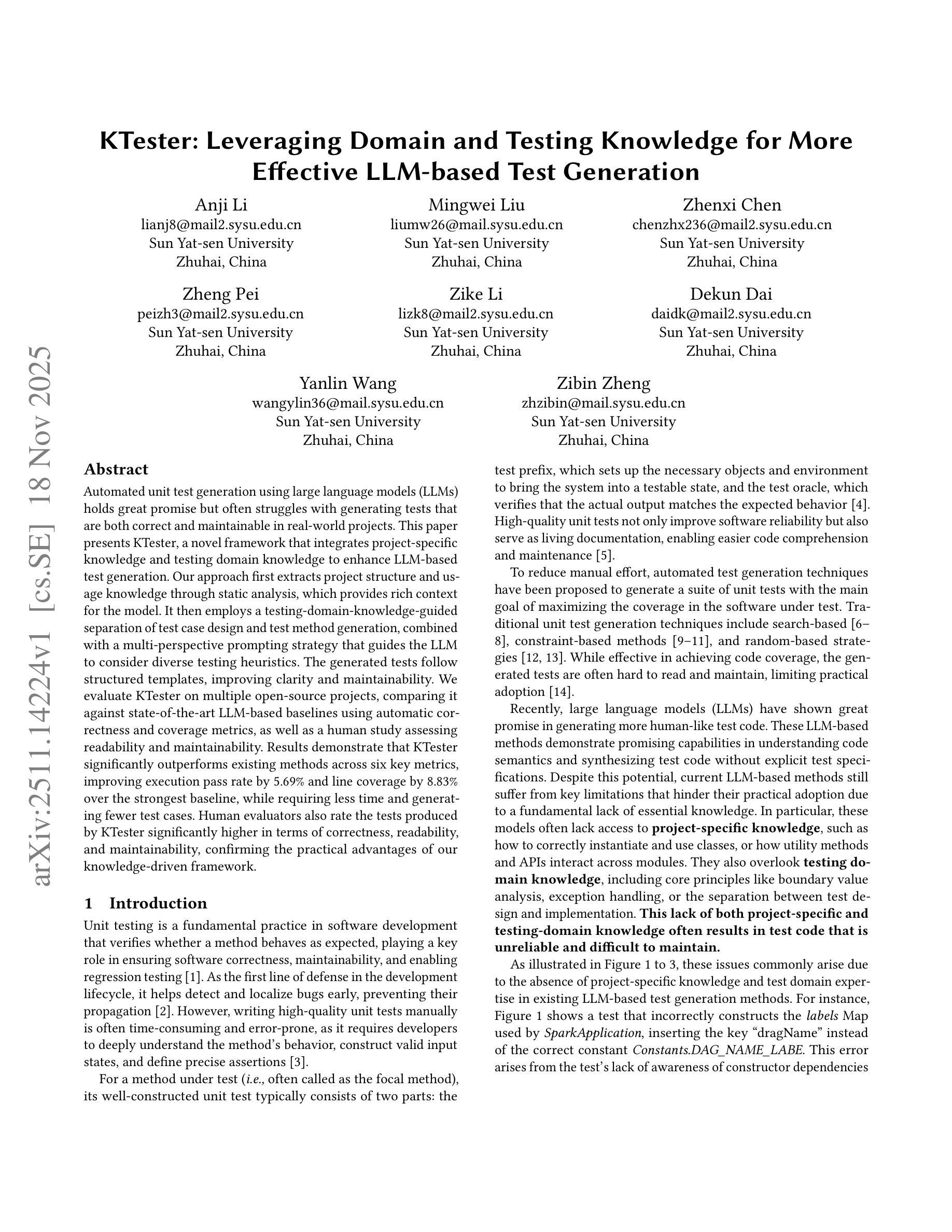使用大型语言模型(LLM)进行自动化单元测试生成具有巨大的潜力,但在生成既正确又可在实际项目中维护的测试时常常遇到困难。本文提出了KTester,一个结合特定项目知识和测试领域知识的新型框架,以增强基于LLM的测试生成。我们的方法首先通过静态分析提取项目结构和使用知识,为模型提供丰富的上下文。然后,它采用测试领域知识指导的测试案例设计和测试方法生成的分离,结合多角度提示策略,引导LLM考虑各种测试启发式方法。生成的测试遵循结构化模板,提高了清晰度和可维护性。我们在多个开源项目上评估了KTester,与最新的LLM基线使用自动正确性和覆盖率指标进行比较,以及一项评估可读性和可维护性的人类研究。结果表明,KTester在六个关键指标上显著优于现有方法,在最强基线上提高了执行通过率5.6 百分比和代码覆盖率提高了 8.8 百分比 ,同时需要更少的时间和生成的测试用例更少。人类评估者也对KTester产生的测试在正确性、可读性和可维护性方面给予了更高的评价,这证实了我们的知识驱动框架的实际优势。