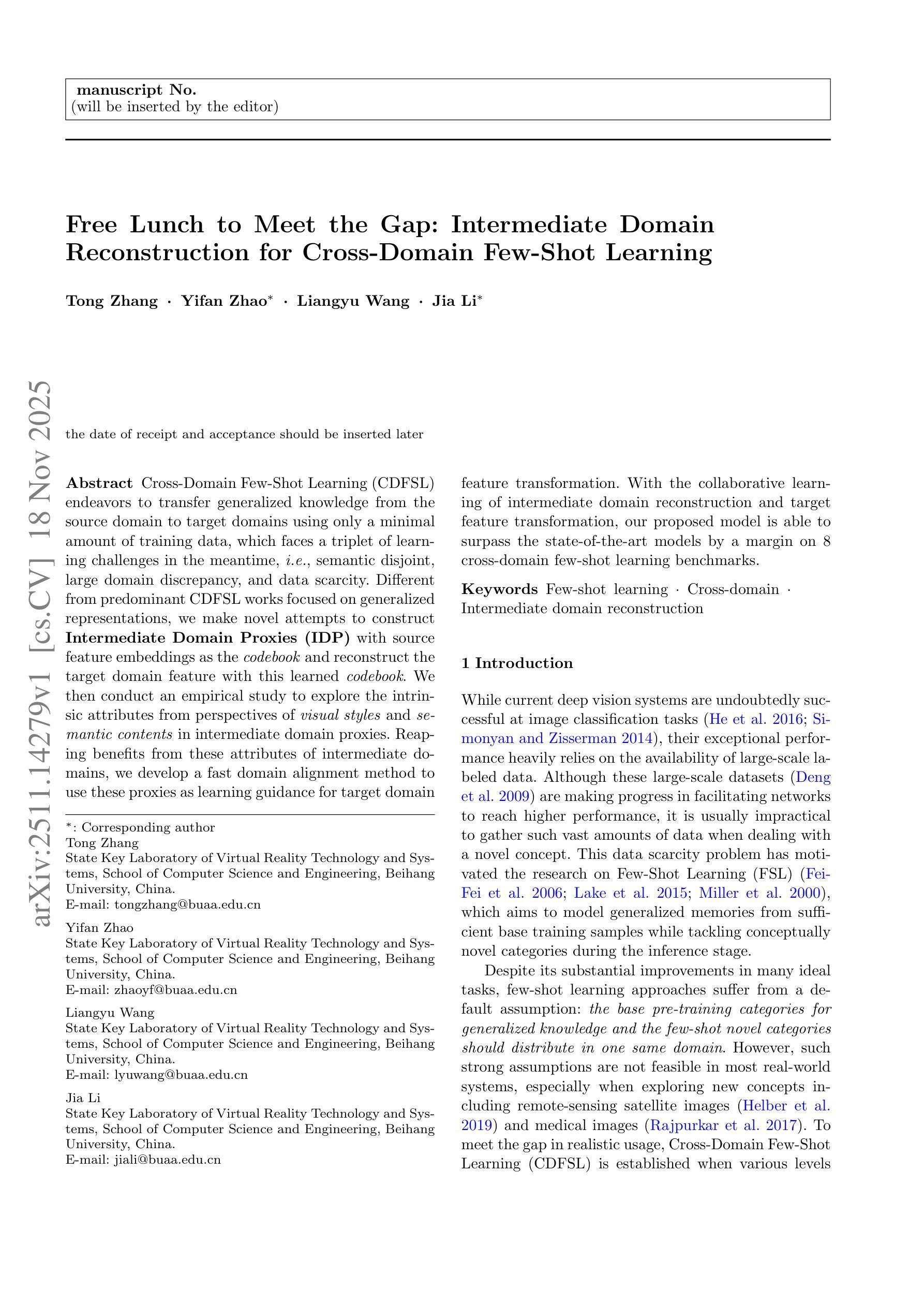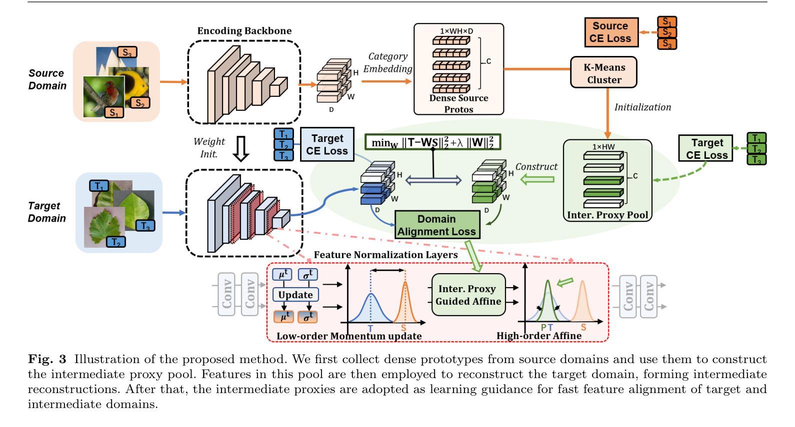 跨域小样本学习(CDFSL)致力于仅使用少量训练数据,从源域转移通用知识到目标域,与此同时,它面临着三个学习挑战,即语义不相关、域差异大和数据稀缺。与主流的CDFSL工作集中在通用表示上不同,我们新颖地尝试构建以源特征嵌入作为代码本的中介域代理(IDP),并用这个学习到的代码本重建目标域特征。然后,我们从中介域代理的视觉风格和语义内容等角度进行实证研究,探索其内在属性。受益于中介域的这些属性,我们开发了一种快速域对齐方法,利用这些代理作为目标域特征转换的学习指南。通过中介域重建和目标特征转换的协同学习,我们提出的模型能够在8个跨域小样本学习基准测试上超越最新模型。