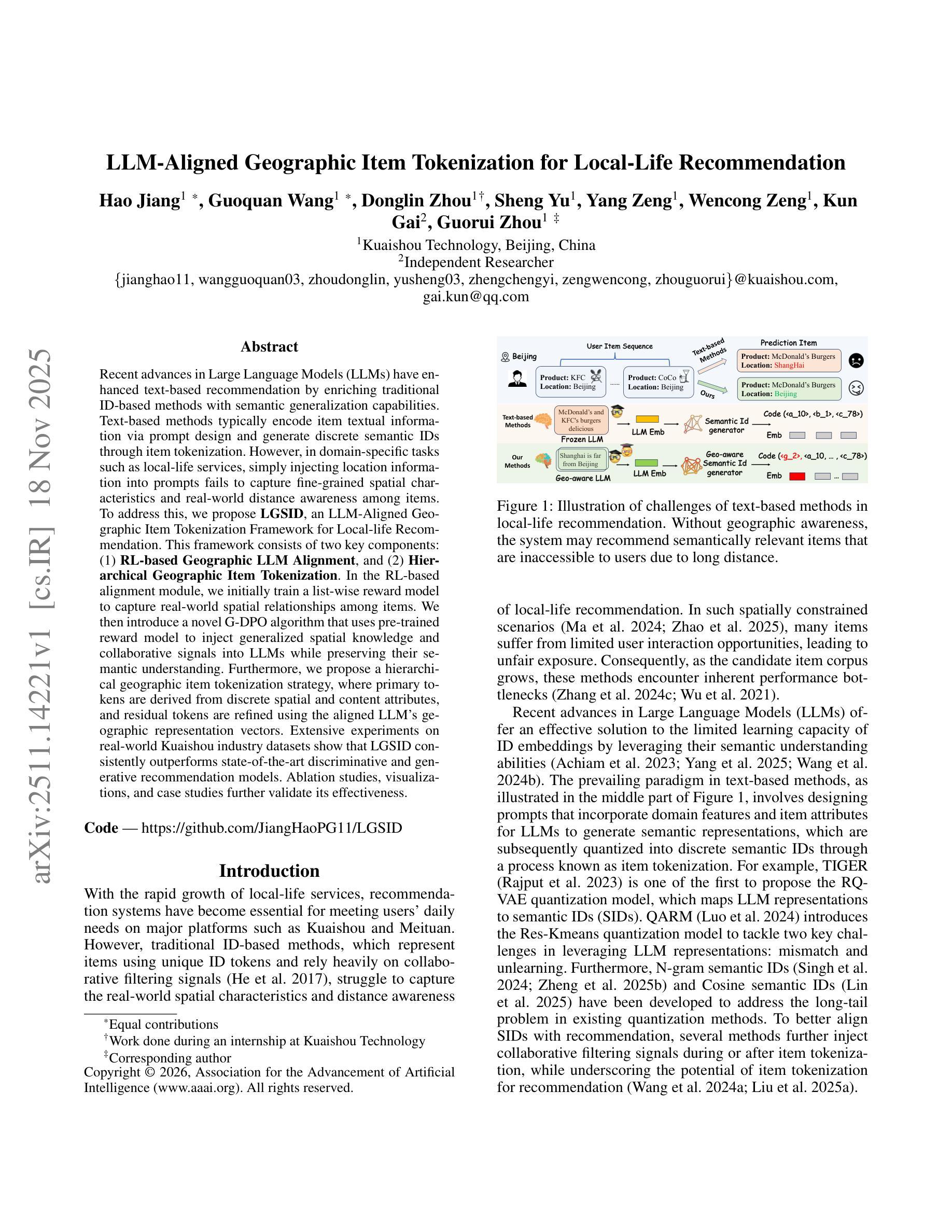 大型语言模型(LLM)的最新进展通过语义泛化能力丰富了传统的基于ID的方法,从而提高了基于文本的推荐。针对领域特定任务如本地生活服务,提出LGSID框架,包括RL基于地理的LLM对齐和分层地理项目令牌化。实验表明,LGSID在快手行业数据集上始终优于最新的判别和生成推荐模型。