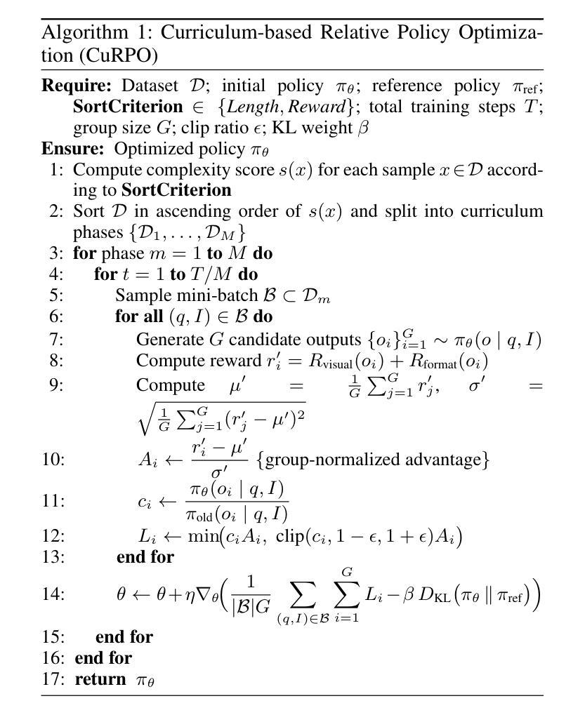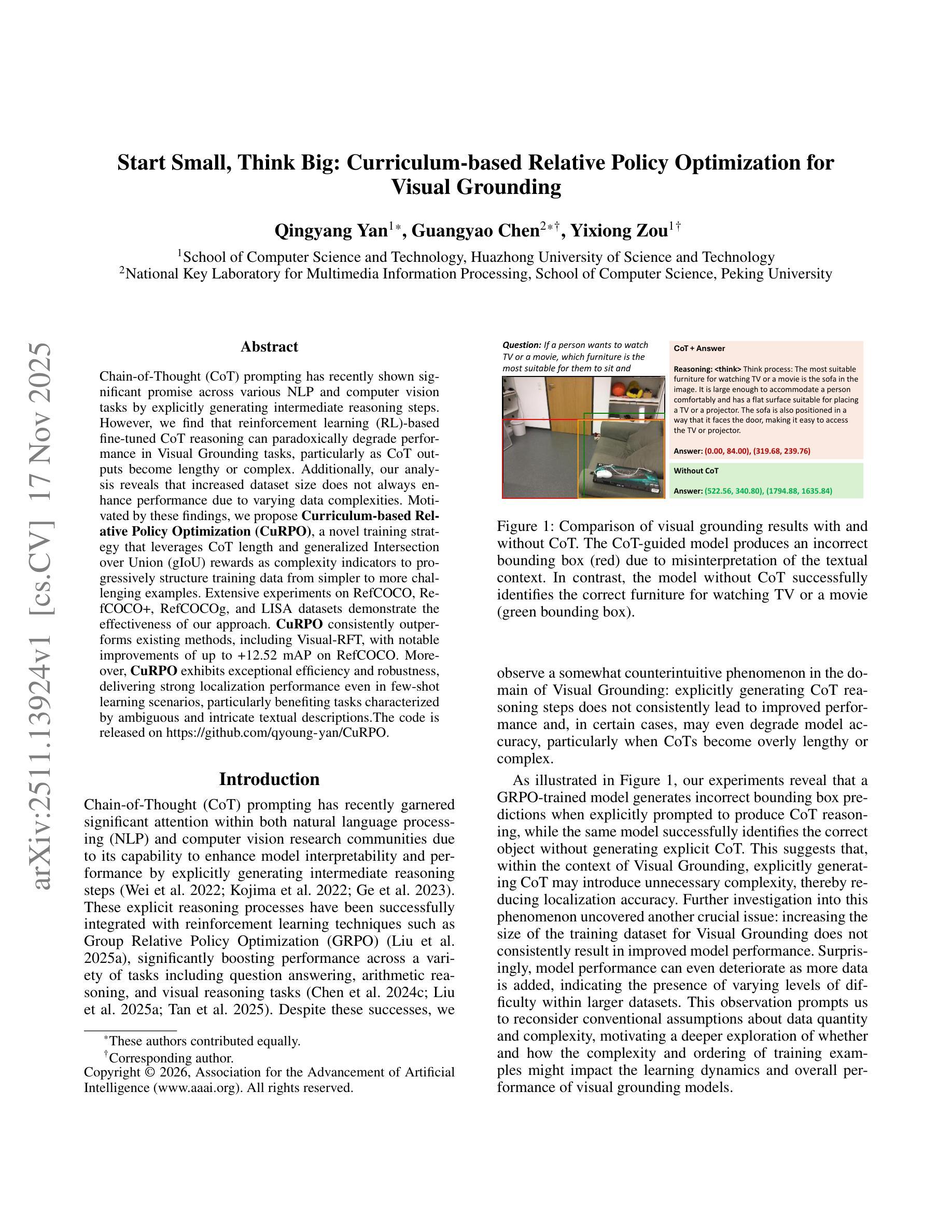 “链式思维(Chain-of-Thought,简称CoT)提示在多种NLP和计算机视觉任务中展现出巨大的潜力,通过明确生成中间推理步骤。然而,我们发现基于强化学习(RL)的微调CoT推理在视觉定位任务中会出现性能悖论性下降的情况,特别是在CoT输出变得冗长或复杂时。此外,我们的分析表明,增加数据集的大小并不总是能提高性能,因为数据复杂性各不相同。基于这些发现,我们提出了基于课程的相对策略优化(CuRPO)这一新颖的训练策略,它利用CoT长度和广义交并比(gIoU)奖励作为复杂性指标,以从简单到复杂示例的方式逐步构建训练数据。在RefCOCO、RefCOCO+、RefCOCOg和LISA数据集上的大量实验证明了我们的方法的有效性。CuRPO持续超越现有方法,包括Visual-RFT,在RefCOCO上的改进达到了+12.52 mAP。此外,CuRPO表现出惊人的效率和稳健性,即使在少样本学习场景中也能提供出色的定位性能,尤其有利于涉及模糊和复杂文本描述的任务。代码已发布在https://github.com/qyoung-yan/CuRPO。“