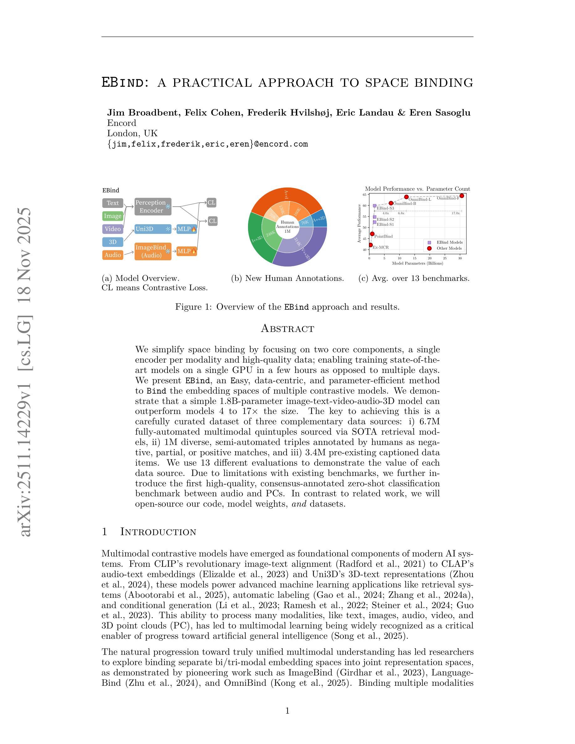 本文介绍了EBind方法,这是一种简单、以数据为中心和参数高效的绑定多个对比模型嵌入空间的方法。通过专注于两个核心组件:每模态的单编码器和高质量数据,使得在单个GPU上训练最先进的模型的时间从数天缩短到数小时。实验表明,一个简单的1.8B参数的图像-文本-视频-音频-3D模型可以优于4到17倍的模型。关键的成功因素在于使用了三种互补数据源:全自动的多模态五元组、人类标注的负面、部分或正面匹配的三元组和预存的带说明的数据项。每个数据源的价值都通过多个评估来证明。同时,本文还推出了首个高质量、共识标注的零样本分类基准测试,用于音频和PC之间的对比。本文公开了代码、模型权重和数据集。