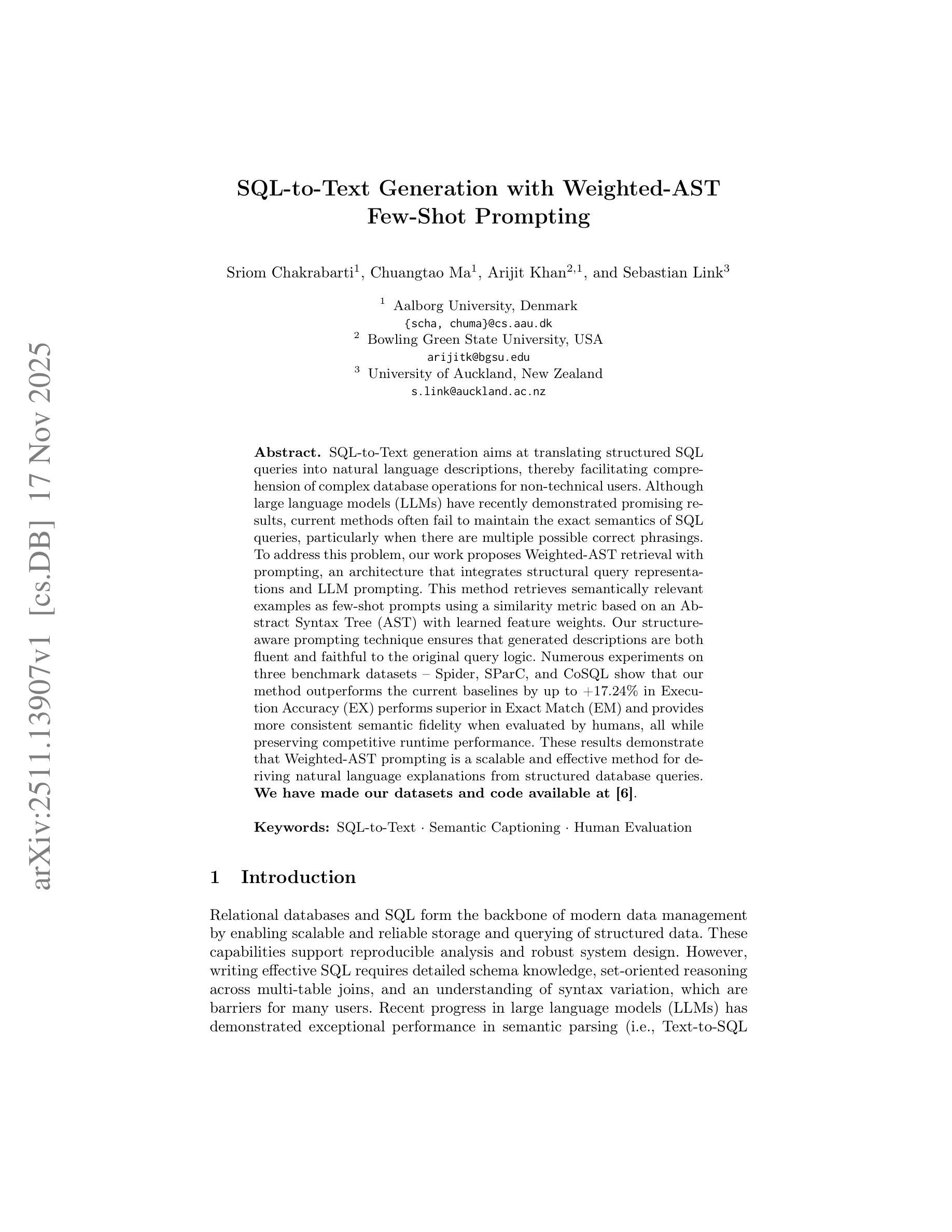 SQL-to-Text生成旨在将结构化SQL查询翻译为自然语言描述,帮助非技术用户理解复杂的数据库操作。尽管大型语言模型(LLM)已有较好表现,但当前方法往往无法保持SQL查询的确切语义,特别是在有多种可能正确表述时。为解决此问题,本研究提出Weighted-AST检索与提示架构,结合结构化查询表示与LLM提示。该方法使用基于抽象语法树(AST)的相似度度量和学习的特征权重,检索少量相关示例作为提示。结构感知提示技术确保生成的描述既流畅又忠实于原始查询逻辑。在Spider、SParC和CoSQL三个基准数据集上的实验表明,该方法在执行准确度(EX)上较当前基线高出+17.24%,在精确匹配(EM)上表现更优,人类评估的语义保真度也更高,同时保持竞争力运行时间性能。结果表明,Weighted-AST提示是一种从结构化数据库查询中派生出自然语言解释的有效且可扩展方法。