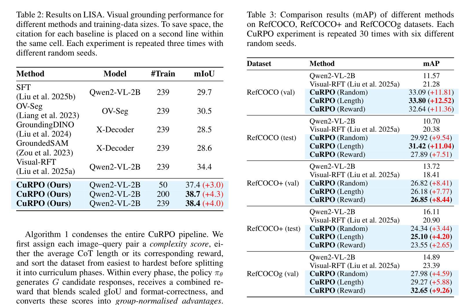- CuRPO是一种新的训练策略,通过利用CoT长度和gIoU奖励作为复杂性指标来渐进式结构化训练数据。