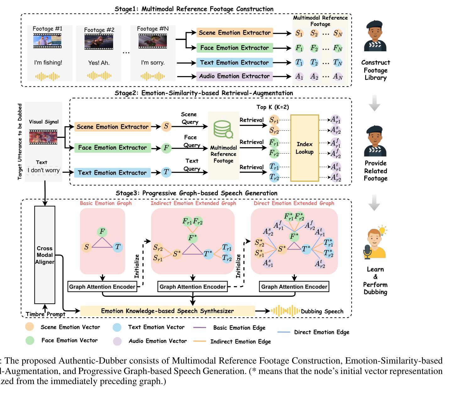 自动电影配音模型能够根据给定的脚本生成生动逼真的语音,从简短的音色提示中复制演讲者的音色,同时确保与无声视频的唇同步。现有方法模拟了一个简化的工作流程,即演员直接进行配音而无需准备,从而忽视了关键的导演与演员之间的互动。相比之下,真实的工作流程涉及动态的协作:导演积极与演员合作,指导他们理解上下文线索,特别是在表演前的情绪。为了解决这一问题,我们提出了一种新的基于检索的导演-演员交互学习方案,以实现真实的电影配音,称为“真实配音器”,其中包含三种新颖机制:(1)我们构建了一个多模态参考素材库,以模拟导演提供的学习素材。值得注意的是,我们整合了大型语言模型(LLM),以实现跨多模态信号的深层情感表示理解。(2)为了模拟演员在配音过程中如何有效且全面地内化导演提供的素材,我们提出了一种基于情感相似性的检索增强策略。该策略检索与目标无声视频最相关的多模态信息。(3)我们开发了一种基于渐进图谱的语音生成方法,该方法会逐步融入检索到的多模态情感知识,从而模拟演员的最终配音过程。上述机制使真实配音器能够忠实地复制真实的配音工作流程,在情感表达方面取得了全面的改进。在V2C Animation基准数据集上的主观和客观评估都验证了其有效性。代码和演示可在https://github.com/AI-S2-Lab/Authentic-Dubber上找到。