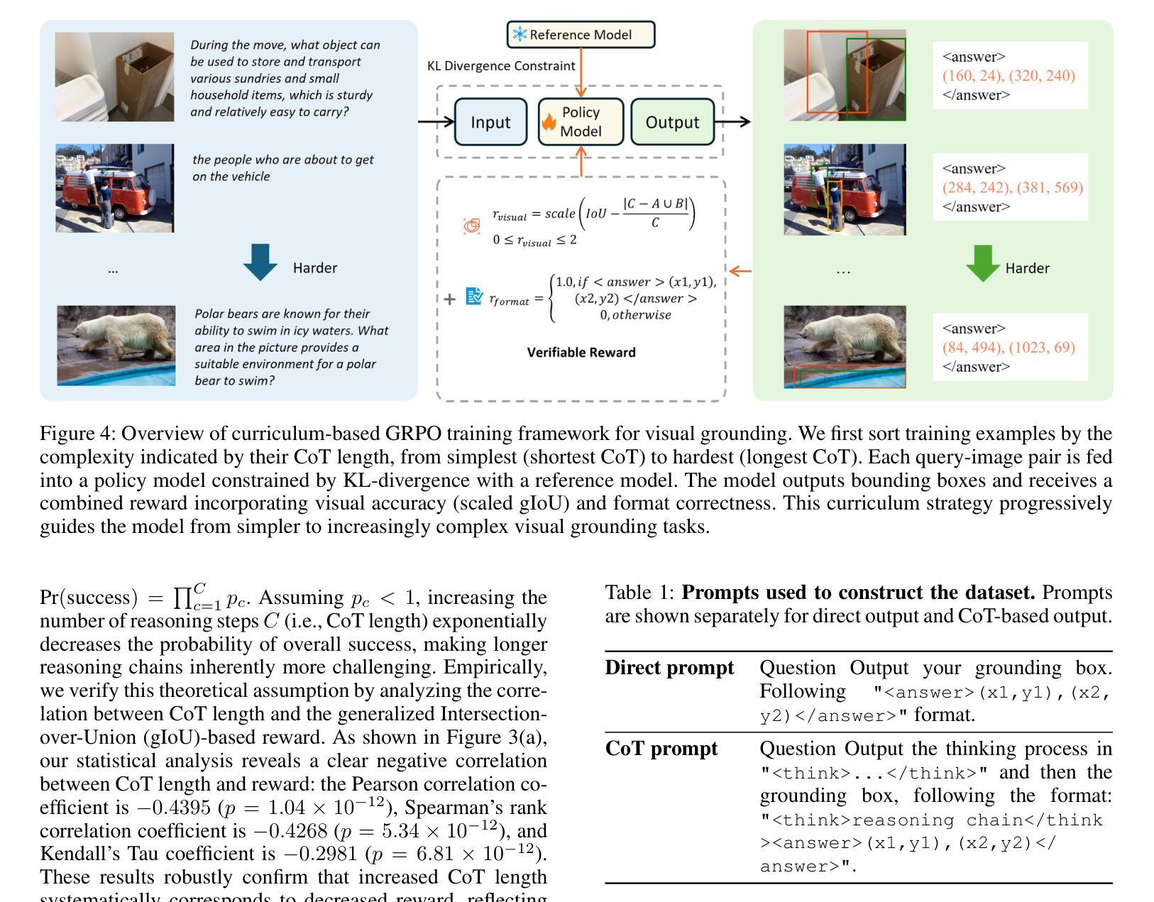 链式思维(Chain-of-Thought,简称CoT)提示法在各NLP和计算机视觉任务中展现出巨大潜力,通过明确生成中间推理步骤,能有效促进推理过程。然而,我们发现基于强化学习(Reinforcement Learning,简称RL)进行fine-tuning的CoT推理在视觉定位任务中会表现出性能降级,尤其在CoT输出复杂且详细时尤为明显。鉴于此,我们提出了基于课程表的相对策略优化(Curriculum-based Relative Policy Optimization,简称CuRPO)方法,利用CoT长度和广义交集联合法(Generalized Intersection over Union,简称gIoU)奖励作为复杂性指标,来结构化从简单到复杂的渐进式训练数据。在RefCOCO、RefCOCO+、RefCOCOg和LISA数据集上的实验证明了我们的方法的有效性。CuRPO方法相较于现有方法如Visual-RFT有明显优势,在RefCOCO数据集上提升最高可达+12.52 mAP。此外,CuRPO展现出卓越的效率与稳健性,即使在少样本学习场景下也能实现出色的定位性能,尤其适用于文本描述模糊且复杂的任务。