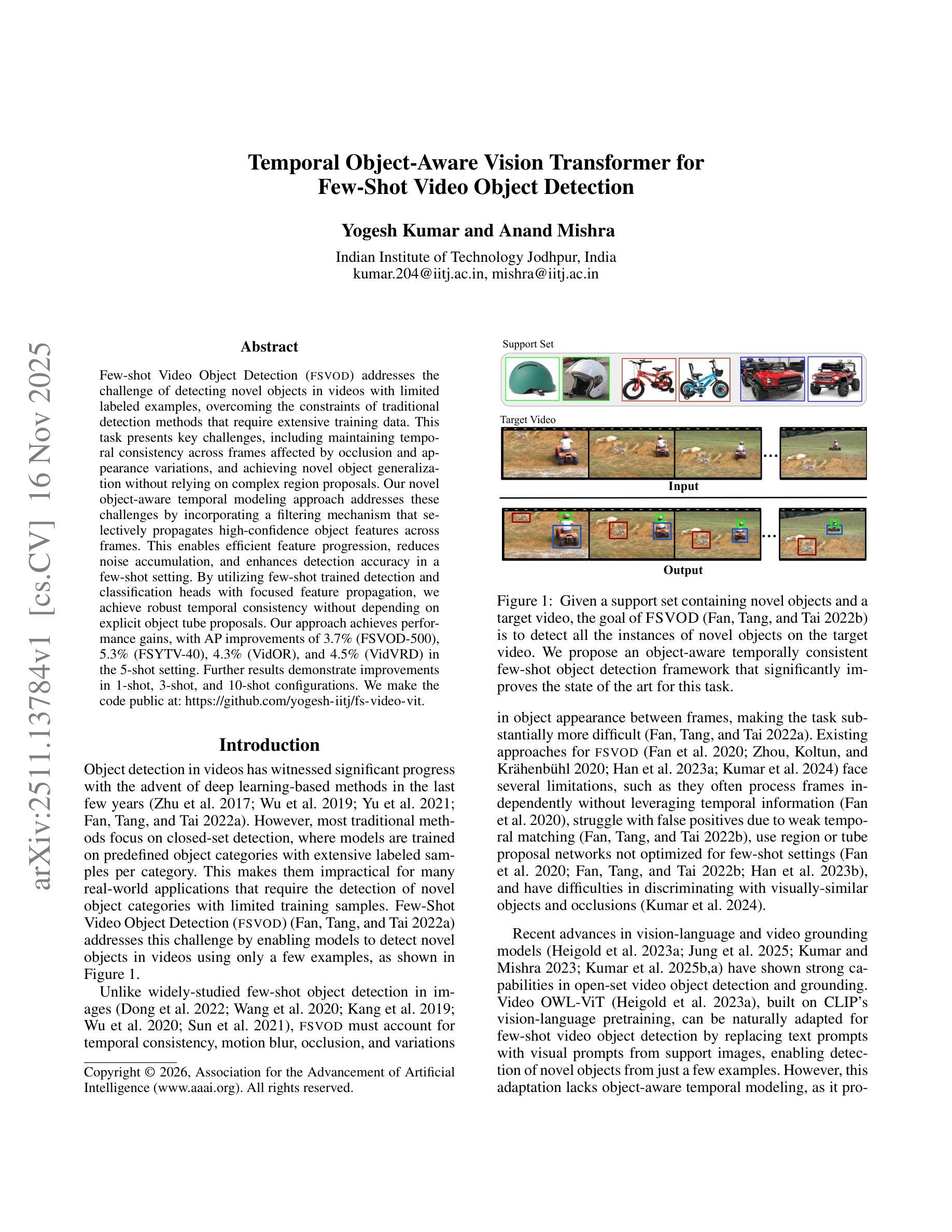 少样本视频目标检测(FSVOD)解决了在有限标记样本中检测新视频目标的挑战,克服了传统检测方法需要大量训练数据的限制。此任务面临关键挑战,包括维持受遮挡和外观变化影响的帧之间的时间一致性,以及在不需要复杂区域提案的情况下实现新对象泛化。复杂的区域提案通常计算量大,需要特定任务训练。我们的新型目标感知时间建模方法通过引入过滤机制来应对这些挑战,该机制可选择性地在帧之间传播高置信度的目标特征。这实现了有效的特征进展,减少了噪声累积,并在少量样本设置中提高了检测准确性。通过利用少量样本训练的检测和分类头以及有针对性的特征传播,我们在不依赖显式对象管提案的情况下实现了稳健的时间一致性。我们的方法在FSVOD-500、FSYTV-40、VidOR和VidVRD的5次射击设置上分别提高了AP值3.7%、5.3%、4.3%和4.5%。进一步的结果展示了在单次射击、三次射击和十次射击配置中的改进。我们在以下网址公开了代码:https://github.com/yogesh-iitj/fs-video-vit。