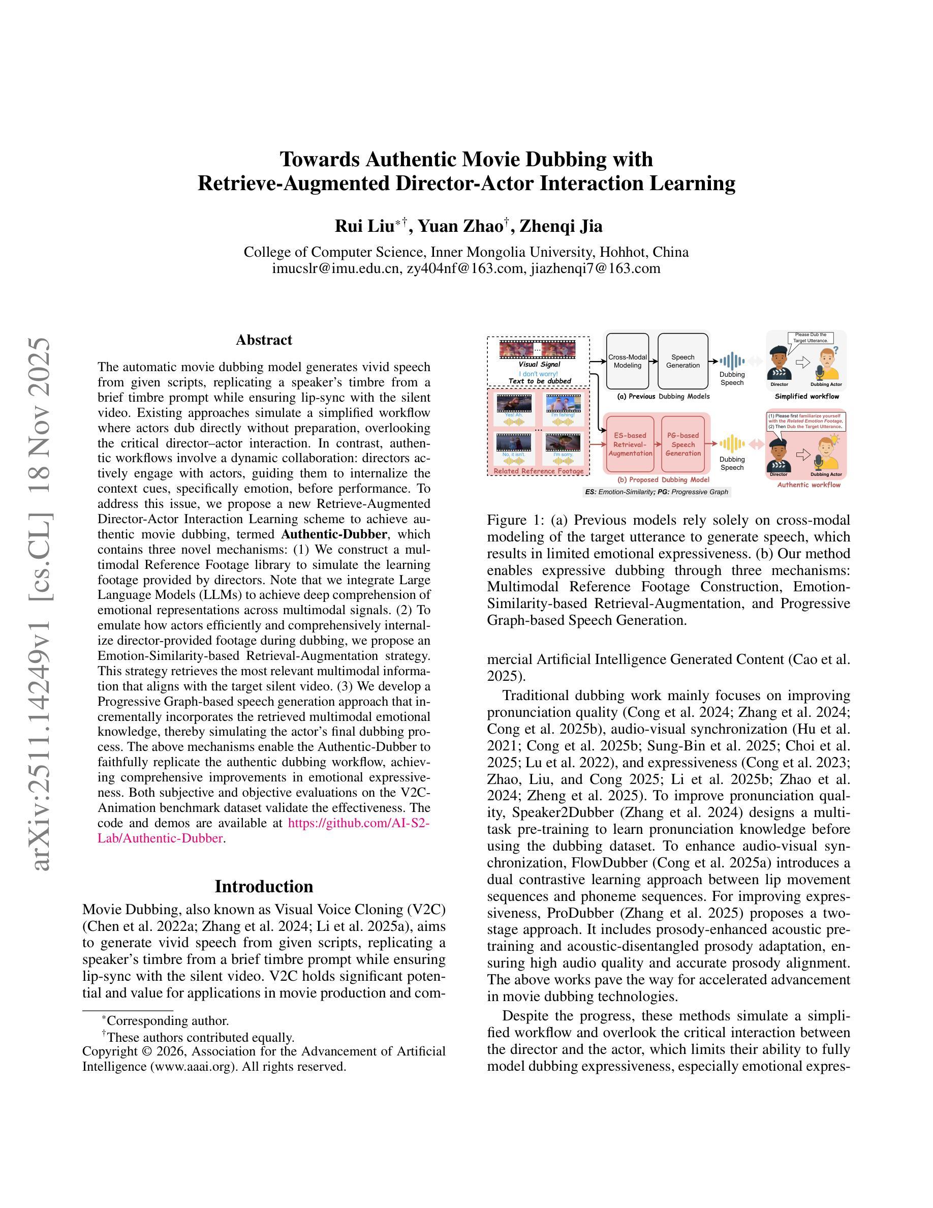 The automatic movie dubbing model generates vivid speech from given scripts, replicating a speaker’s timbre from a brief timbre prompt while ensuring lip-sync with the silent video. Existing approaches simulate a simplified workflow where actors dub directly without preparation, overlooking the critical director-actor interaction. In contrast, authentic workflows involve a dynamic collaboration: directors actively engage with actors, guiding them to internalize the context cues, specifically emotion, before performance. To address this issue, we propose a new Retrieve-Augmented Director-Actor Interaction Learning scheme to achieve authentic movie dubbing, termed Authentic-Dubber, which contains three novel mechanisms: (1) We construct a multimodal Reference Footage library to simulate the learning footage provided by directors. Note that we integrate Large Language Models (LLMs) to achieve deep comprehension of emotional representations across multimodal signals. (2) To emulate how actors efficiently and comprehensively internalize director-provided footage during dubbing, we propose an Emotion-Similarity-based Retrieval-Augmentation strategy. This strategy retrieves the most relevant multimodal information that aligns with the target silent video. (3) We develop a Progressive Graph-based speech generation approach that incrementally incorporates the retrieved multimodal emotional knowledge, thereby simulating the actor’s final dubbing process. The above mechanisms enable the Authentic-Dubber to faithfully replicate the authentic dubbing workflow, achieving comprehensive improvements in emotional expressiveness. Both subjective and objective evaluations on the V2C Animation benchmark dataset validate the effectiveness. The code and demos are available at https://github.com/AI-S2-Lab/Authentic-Dubber.