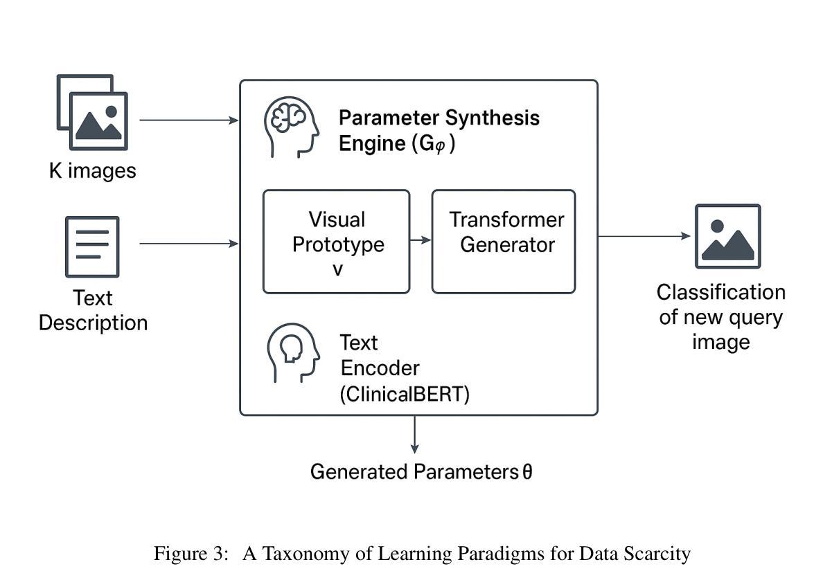 深度学习模型在医学图像分析方面取得了显著的成功,但从根本上受到大规模精细标注数据集需求的制约。在医学领域,对“大数据”的依赖是一个关键的瓶颈,因为患者数据本质上难以获取,专家标注成本高昂,尤其是对于定义上样本稀缺的罕见疾病。为了克服这一基本挑战,我们提出了一种新型范式:零训练任务特定模型合成(ZS-TMS)。我们的方法不是适应现有模型或训练一个新模型,而是利用大规模预训练生成引擎直接合成针对特定任务的分类器的整个参数集。我们的框架,语义引导参数合成器(SGPS),以最少的多模式任务信息作为输入,只需要一个示例图像(一次拍摄)和相应的临床文本描述,就可以直接合成针对特定任务的分类器的整个参数集。生成引擎会解释这些输入以生成轻量级高效分类器的权重(例如EfficientNet-V2),该分类器可以立即部署进行推理,无需任何特定任务的训练或微调。我们在ISIC 2018皮肤病变数据集和自定义罕见疾病数据集上进行了具有挑战性的少量样本分类基准测试。结果表明,SGPS建立了新的最先进的性能,显著优于先进的少量样本和零样本学习方法,尤其在1个和5个样本分类的超低数据状态下。这项工作为AI驱动的诊断工具的快速开发和部署铺平了道路,特别是在数据极为有限的罕见疾病长尾领域。