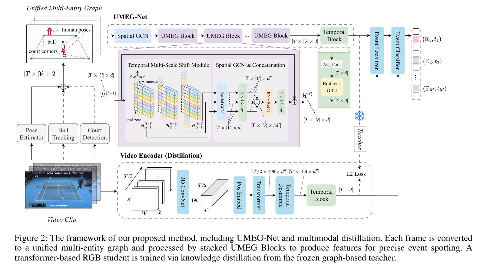 精确事件定位(PES)旨在精确时刻识别精细粒度的事件,已成为体育分析的关键组成部分。由于事件快速连续发生、运动模糊和细微的视觉差异,此任务颇具挑战性。因此,大多数现有方法都依赖于特定领域的端到端训练以及大量标记数据集,并且由于它们仅依赖于像素或基于姿势的输入,因此在小样本条件下往往表现挣扎。然而,获取大量标记数据集在实际中是很困难的。我们提出了一种用于小样本PES的统一多实体图网络(UMEG-Net)。UMEG-Net将人体骨骼和运动特定对象关键点集成到一个统一图中,并基于高级GCN和多尺度时间移位功能,具有高效的空间时间提取模块。为了进一步提高性能,我们采用多模态蒸馏技术,将基于关键点的图形的知识转移到视觉表示中。我们的方法在有限标记数据上表现稳健,在小样本设置中显著优于基准模型,为小样本科提供了可扩展和有效的解决方案。代码公开在:https://github.com/LZYAndy/UMEG-Net。