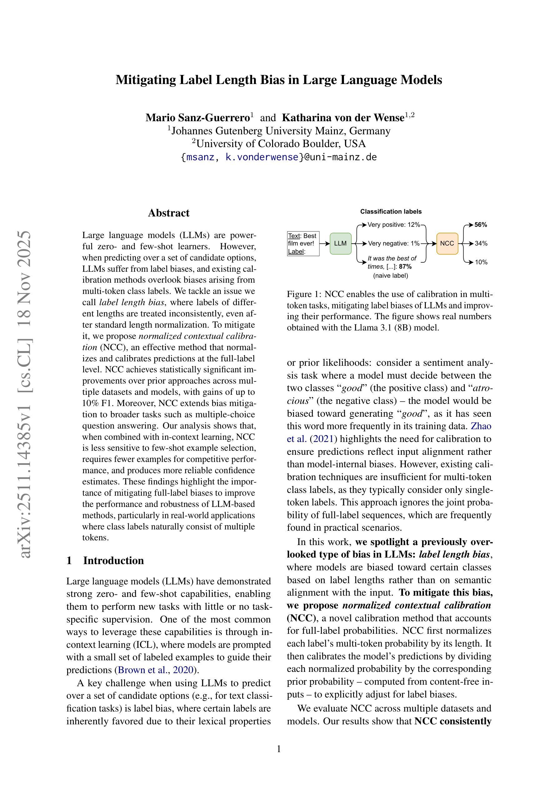 大型语言模型(LLM)在零样本和少样本学习中表现出强大的能力,但在预测候选选项集时,易受标签偏差影响。现有校准方法忽略了由多令牌类别标签产生的偏差。针对标签长度偏差问题,即使在进行标准长度归一化后,不同长度的标签处理仍不一致。为解决此问题,提出了归一化上下文校准(NCC)方法,该方法在全长标签级别对预测进行归一化和校准。NCC在多个数据集和模型上实现了对先前方法的统计显著改进,F1得分提高高达10%。此外,NCC将偏差缓解扩展到更广泛的任务,如多项选择题回答。分析表明,结合上下文学习,NCC对少样本示例选择不那么敏感,竞争性能所需的示例更少,并产生更可靠的信心估计。这些发现强调减轻全长标签偏差的重要性,有助于提高LLM方法性能和稳健性,特别是在类别标签自然包含多个令牌的实际应用中。