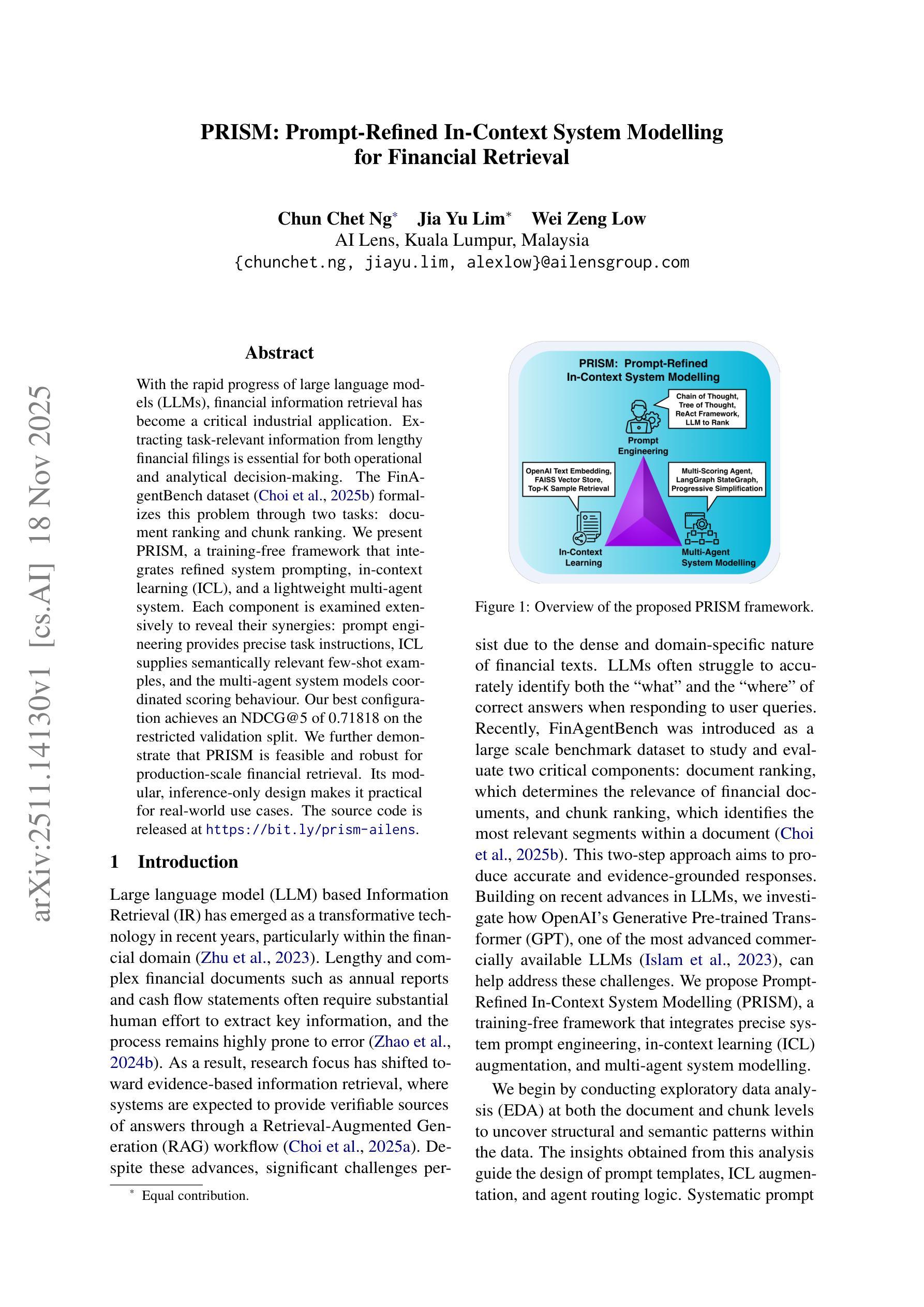 随着大型语言模型(LLM)的快速发展,金融信息检索已成为一项重要的工业应用。从冗长的财务文件中提取与任务相关的信息是操作和决策分析的关键。FinAgentBench数据集通过两个任务:文档排名和块排名,正式解决了这个问题。我们提出了PRISM,这是一个无需训练的框架,它集成了精细的系统提示、上下文学习(ICL)和轻量级的多智能体系统。我们对每个组件进行了广泛的研究,以揭示它们的协同作用:提示工程提供精确的任务指令,上下文学习提供语义上相关的少量样本,多智能体系统对协调评分行为进行建模。我们的最佳配置在受限的验证集上实现了NDCG@5为0.71818的成绩。我们进一步证明PRISM对于生产规模的金融检索是可行和稳健的。其模块化、仅推理的设计使其成为真实世界用例的实际选择。源代码已发布在https://bit.ly/prism-ailens。