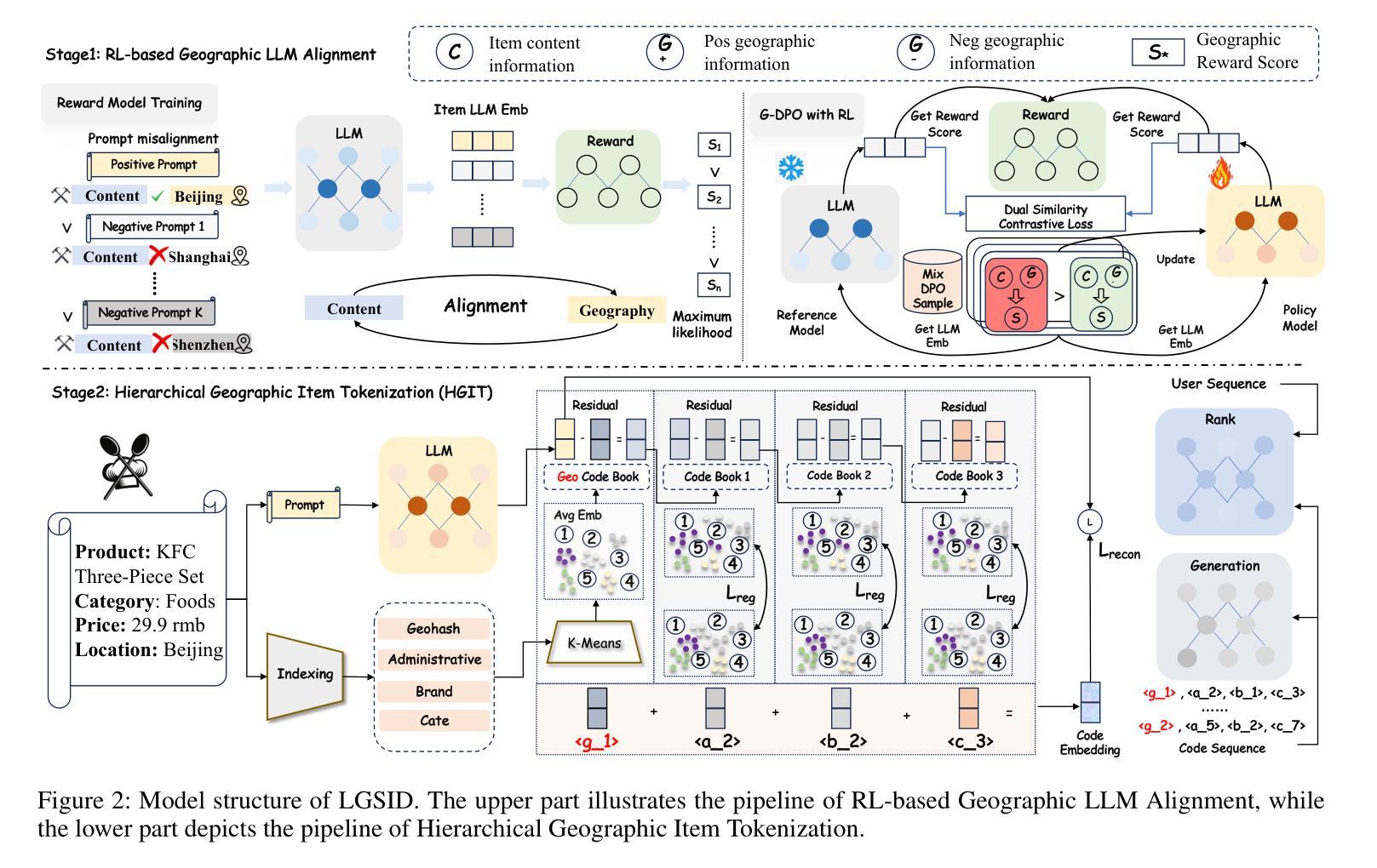 - LGSID框架包括两个关键组件:RL基于地理的LLM对齐和分层地理项目令牌化。