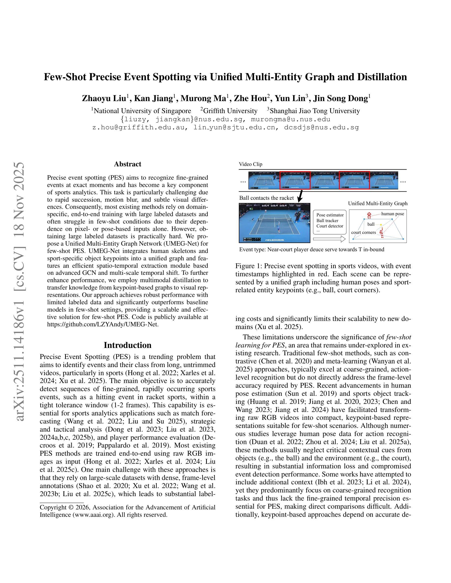 Precise event spotting (PES) aims to recognize fine-grained events at exact moments and has become a key component of sports analytics. This task is particularly challenging due to rapid succession, motion blur, and subtle visual differences. Consequently, most existing methods rely on domain-specific, end-to-end training with large labeled datasets and often struggle in few-shot conditions due to their dependence on pixel- or pose-based inputs alone. However, obtaining large labeled datasets is practically hard. We propose a Unified Multi-Entity Graph Network (UMEG-Net) for few-shot PES. UMEG-Net integrates human skeletons and sport-specific object keypoints into a unified graph and features an efficient spatio-temporal extraction module based on advanced GCN and multi-scale temporal shift. To further enhance performance, we employ multimodal distillation to transfer knowledge from keypoint-based graphs to visual representations. Our approach achieves robust performance with limited labeled data and significantly outperforms baseline models in few-shot settings, providing a scalable and effective solution for few-shot PES. Code is publicly available at https://github.com/LZYAndy/UMEG-Net.